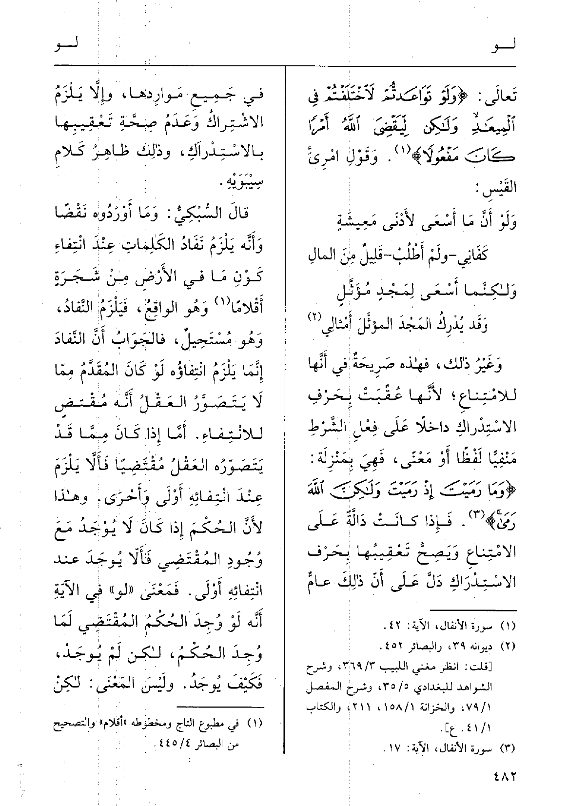 وَقد يُدْرِكُ المَجْد المُؤثل أَمْثاليوغَيْرُ ذلكَ. فَهَذِهِ صَرِيحةٌ فِي أَنَّها للامْتِناع لأنَّها عقبت بحَرْفِ الاسْتِدْراكِ دَاخِلا على فِعْلِ الشَّرْطِ مَنْفيّاً أَو معْنًى، فَهِيَ بمنْزِلَةِ وَمَا رَمَيْتُ إِذْ رَمَيْتُ ولكنْ اللهاَ رَمَى، فَإِذا كَانَت دَالَّةً على الامْتِناعِ ويصحُّ تعقيبُها بحَرْفِ الاسْتِدْراكِ دلَّ على أنَّ ذلكَ عامٌّ فِي جميعِ مَوارِدِها وإلاَّ يلزمُ الاشْتِراكُ وعَدَمُ صحَّةِ تعقيبها بالاسْتِدراكِ، وذلكَ ظاهِرُ كلامُ سِيبَوَيْهٍ.