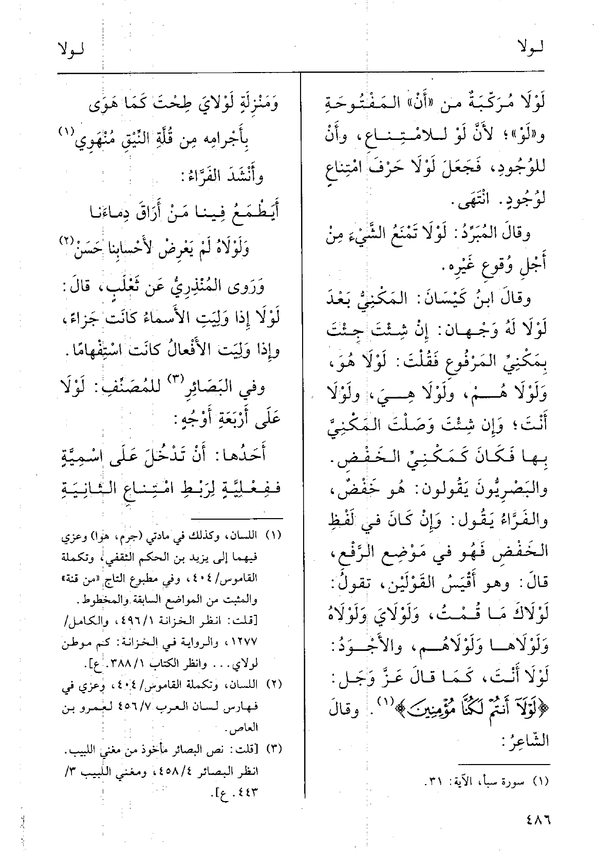 وَقَالَ ابنُ كَيْسان: المَكْنِيُّ بَعْدَ لَوْلا لَهُ وَجْهان: إنْ شِئْتَ جِئْتَ بمَكْني المَرْفوع فقلْتَ لَوْلا هُوَ {ولَوْلا هُمْ ولَوْلا هِيَ ولَوْلا أَنْتَ، وإنْ شِئْتَ وصلْتَ المَكْنيَّ بهَا فَكَانَ كمَكْنِيِّ الخَفْضِ، والبَصْريّون يقولونَ: هُوَ خَفْض، والفرَّاء يقولُ. وَإِن كانَ فِي لَفْظِ الخَفْضِ فَهُوَ فِي مَوْضِعِ الرَّفْع، قالَ: وَهُوَ أَقْيَسُ القَوْلَيْن، تَقول:} لَوْلاكَ مَا قُمْتُ {ولَوْلايَ} ولَوْلاهُ {ولَوْلاهَا} ولَوْلاهُم، والأجْودُ لَوْلا أَنْتَ كَمَا قَالَ، عزَّ وجلَّ: {لَوْلَا أَنْتُم لكُنَّا مُؤْمِنِين} ؛ وَقَالَ الشاعرُ: