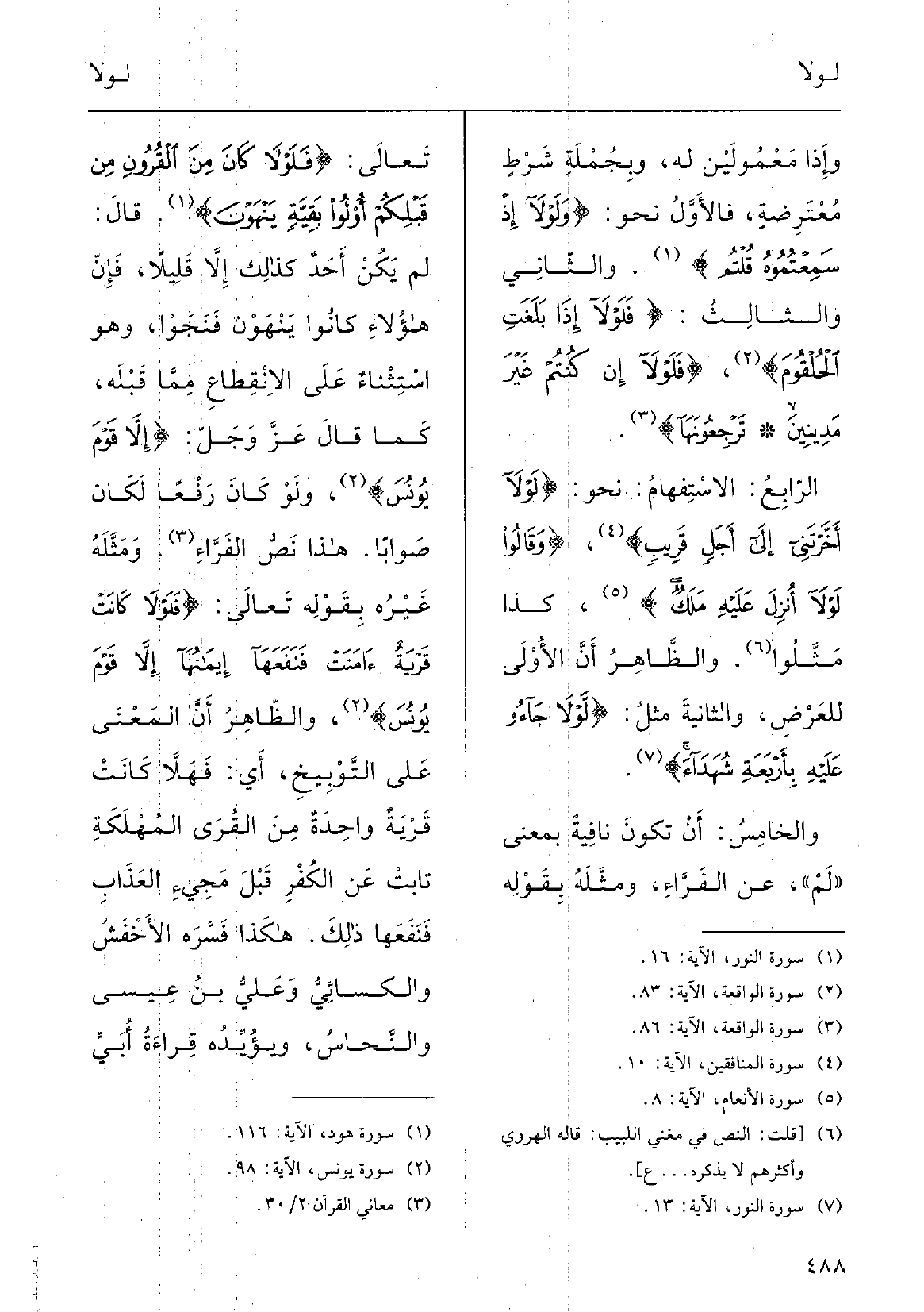 وَالْخَامِس: أنْ تكونَ نافِيَةً بمعْنَى لم، عَن الفرَّاء، وَمثله بقوله تَعَالَى: {} فلَوْلا كانَ مِن القُرونِ مِن قَبْلكم أُولو بَقِية يَنْهونَ} ، قَالَ: لم يَكُنْ أَحدٌ كَذلكَ إلاَّ قَلِيلا، فإنَّ هَؤُلَاءِ كَانُوا يَنْهون فَنَجوا، وَهُوَ اسْتِثناءٌ على الانْقِطاع ممَّا قَبْله، كَمَا قَالَ، عزَّ وجلَّ: {إلاَّ قَوْم يُونُس} ، وَلَو كانَ رَفْعاً لكانَ صَواباً، هَذَا نَصّ الفرَّاء. ومَثَّله غيرُه بقوله تَعَالَى: {فلَوْلا كَانَت قَرْيَة آمَنَتْ فنَفَعَها إيمانُها إلاَّ قَوْم يُونُس} ، والظاهِرُ أَنَّ المَعْنى على التَّوْبيخ، أَي فهَلاَّ كانتْ قَرْيَة واحِدَة مِن القُرَى المُهْلَكَة تابَتْ عَن الكُفْر قَبْل مجيءِ العَذَابِ فنَفَعَها ذلكَ، هَكَذَا فَسَّره الأَخْفَش والكِسائي وعليُّ بنُ عِيسَى والنحَّاسُ، ويُؤَيّدُه قِراءَةُ أُبيَ