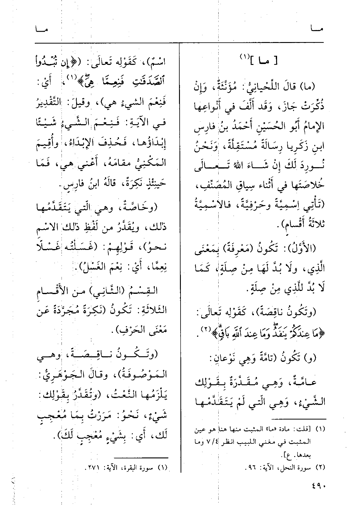 (الأوَّلُ) : تكونُ (مَعْرِفَةً) بمعْنَى الَّذِي وَلَا بُدَّ لَها مِن صِلَةٍ كَمَا لَا بُدَّ للَّذي مِن صِلَةٍ، (وتكونُ ناقِصَةً) ، كَقَوْلِه تَعَالَى: {مَا عِنْدَكُمْ يَنْفَدُ وَمَا عِند الله باقٍ} ؛ و) تكونُ (تامَّةً وَهِي نَوعانِ: عامَّةٌ وَهِي مُقَدَّرَةٌ بقَوْلِكَ الشيءَ، وَهِي الَّتِي لم يَتَقَّدَمْها اسمٌ، كَقَوْلِه تَعَالَى: {إنْ تُبْدوا الصَّدَقاتِ فنِعِمَّا هِيَ} ، أَي فَنِعْمَ الشَّيءُ هِيَ) ، وقيلَ: التَّقْديرُ فِي الآيةِ: فنِعْمَ الشيءُ شَيْئا إبداؤُها فحُذِفَ الإبْداءُ وأُقِيم المَكْنيُ مقامَه أَعْنِي هِيَ فَمَا حينَئِذٍ نَكِرَة؛ قالَهُ ابنُ فارِس. (وخاصَّةً: وَهِي الَّتِي يَتَقَدَّمُها ذلكَ ويُقَدَّرُ مِن لَفْظِ ذلكَ الاسْمِ، نحوُ) قولِهم: (غَسَلْتُه غَسْلاً نِعِمَّا أَي نِعْمَ الغَسْلُ) .
