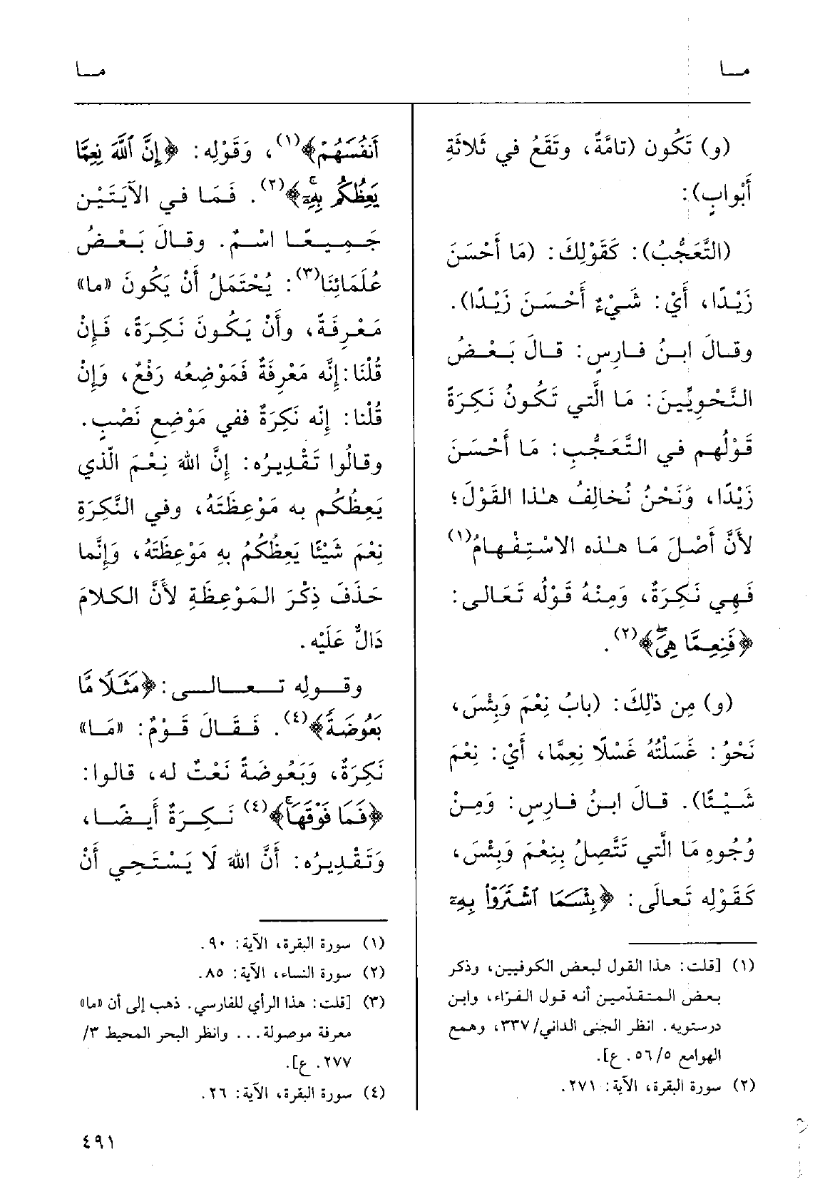 و) تكونُ (تامَّةً وتَقَعُ فِي ثلاثَةِ أَبوابٍ: التّعَجُّبُ) : كَقَوْلِك: (مَا أَحْسَنَ زَيْداً، أَيْ شيءٌ أَحْسَنَ زَيْداً) ، وقالَ ابنُ فارِس: قَالَ بعضُ النَّحويِّين مَا الَّتِي تكونُ نَكِرَةً قَوْلهم فِي التَّعَجُّبِ مَا أَحْسَنَ زَيْداً، ونحنُ نُخالِفُ هَذَا القَوْلَ لأنَّ أَصْلَ مَا هَذِه الاسْتِفهامُ فَهِيَ نَكِرَةٌ، وَمِنْه قَوْله تَعَالَى: {فنِعِمَّا هِيَ} ، (و) ومِن ذلكَ (بابُ نِعْمَ وبِئْسَ نحوُ: غَسَلْتُه غَسْلاً نِعِمَّا، أَي نِعْمَ شَيْئا) ، قَالَ ابنُ فارِس: ومِن وُجُوهِ مَا الَّتِي تَتَّصِلُ بنِعْمَ وبِئْسَ كقَوْله تَعَالَى: {بِئْسَمَا اشْتَروا بِهِ أَنْفُسَهم} ، وَقَوله: {إنَّ ااَ نِعِمَّا يَعظكُم بِهِ} ، فَمَا فِي الْآيَتَيْنِ جَمِيعاً اسْمٌ. وَقَالَ بعضُ عُلمائِنا: يحْتَملُ أَنْ يكونَ مَا مَعْرِفةً وأَنْ يكونَ نَكِرَةً، فإنْ قُلْنا إنَّه مَعْرفَةٌ فمَوضِعُه رَفْعٌ، وإنْ قُلْنا إنَّه نَكِرَةٌ فَفِي مَوْضِعِ نَصْبٍ، وَقَالُوا تَقْديرُه: إنَّ اللهاَ نِعْمَ الَّذِي يعظكُم بِهِ مَوْعِظَته، وَفِي النّكِرَةِ: نِعْم شَيْئا يَعظكُم بِهِ مَوْعِظَته، وإنَّما حُذِفَ ذِكْرُ المَوْعظَةِ لأنَّ الكَلاَمَ دالٌّ عَلَيْهِ، وَقَوله تَعَالَى: {مثلا مَّا بَعُوضَة} ، فَقَالَ قَوْمٌ: مَا نَكِرَة وبَعوضَة نَعْتٌ لَهُ قَالُوا! فَمَا فَوْقهَا نَكِرَة أَيْضا وتقديرُه أَن الله لَا يستحيي أَن