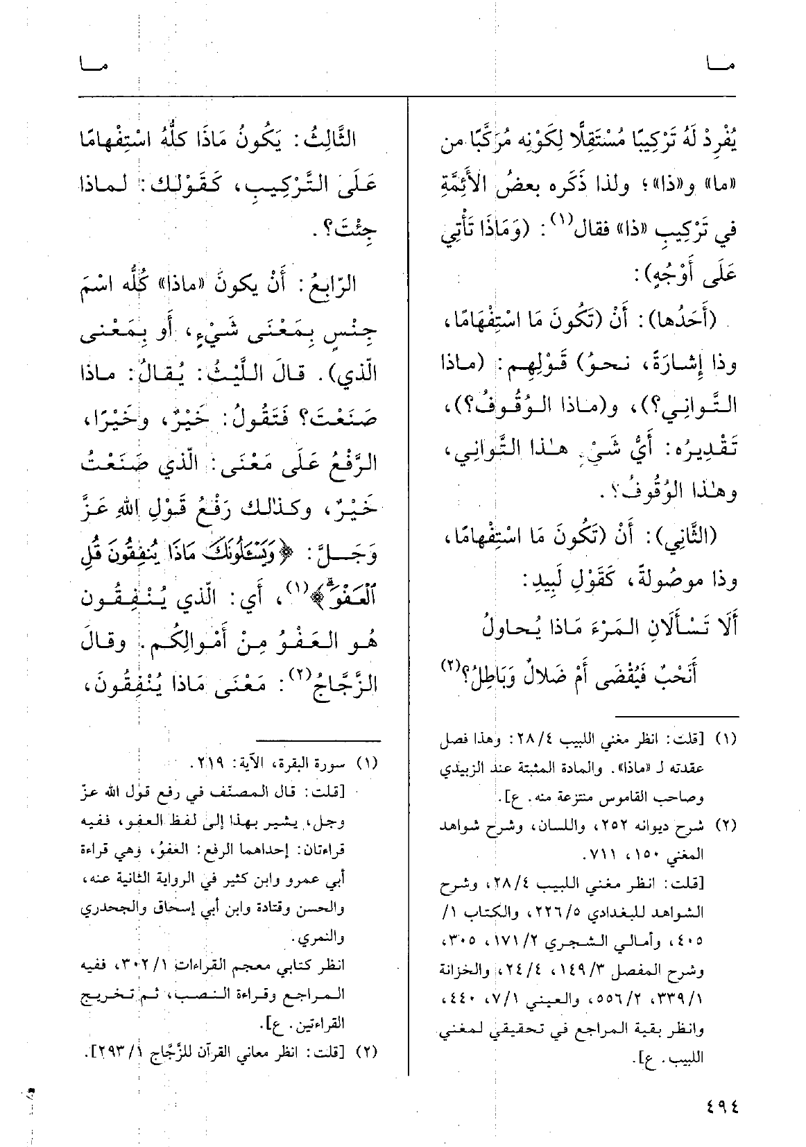 (الَّرابعُ: أَنْ يكونَ مَاذَا كُلُّه اسمَ جِنْسٍ بمعْنَى شيءٍ أَو بمعْنَى الَّذِي) ، قَالَ اللَّيْثُ: يقالُ: مَاذَا صَنَعْتَ؟ فتقولُ: خَيْرٌ وخَيْراً، الرَّفْعُ على مَعْنى الَّذِي صَنَعْت خَيْرٌ، وكَذلكَ رفع قَول الله، عزَّ وجلَّ: {ويَسْألُونَك مَاذَا يُنْفِقُونَ قُلِ العَفْوُ} ، أَي الَّذِي يُنْفِقُونَ هُوَ العَفْوُ مِن أَمْوالِكُم. وَقَالَ الزجَّاج: مَعْنى مَاذَا يُنْفِقُونَ