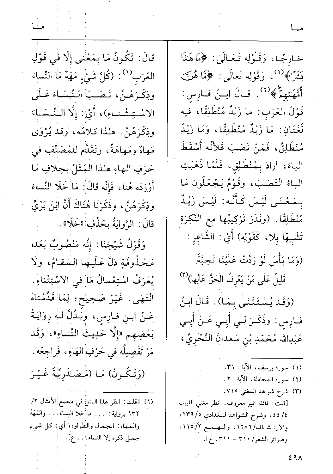 ( {وَمَا بأْسَ لَوْ رَدَّتْ عَلَيْنا تَحِيَّةً (قَليلٌ على مَنْ يَعْرِفُ الحَقَّ عابُها (وَقد يُسْتَثْنَى} بِمَا) ، قَالَ ابنُ فارِس: وذَكَرَ لي أَبي عَن أَبي عبد اللهاِ محمدِ بنِ سَعْدان النّحَوي قالَ: تكونُ مَا بمعْنَى إلاَّ فِي قولِ العَرَبِ: (كلُّ شيءٍ مَهَهٌ مَا النِّساءَ وذِكْرَهُنَّ، نَصَبَ النِّساءَ على الاسْتِثْناءِ) ، أَي إلاَّ النِّساءَ وذِكْرَهُنَّ، هَذَا كَلامُه، وَقد يُرْوَى مَهَاهُ ومَهَاهَة؛ وتقدَّمَ للمصنِّفِ فِي حرف الهاءِ هَذَا المَثَلَ بخِلافِ مَا أَوْرَدَه هُنَا، فإنَّه قالَ: مَا خَلاَ النِّساءِ وذِكْرَهُنَّ، وذَكَرْنا هُنَاكَ أَنَّ ابنَ برِّي قالَ: الرِّوايَةُ بحَذْفِ خلا، وقولُ شيْخِنا أنَّه مَنْصوبٌ بعَدَا محذوفة دلَّ عَلَيْهَا المقامُ وَلَا يُعْرَفُ اسْتِعْمالُ مَا فِي الاسْتِثْناءِ، انتَهَى، غَيْرُ صَحِيح لمَا قدَّمْناه عَن ابنِ فارِس، ويدلُّ لَهُ رِوايَةُ بعضِهم: إلاَّ حدِيثَ النِّساءِ، وَقد مَرَّ تَفْصِيلُه فِي حرْفِ الهاءِ فراجِعْه.