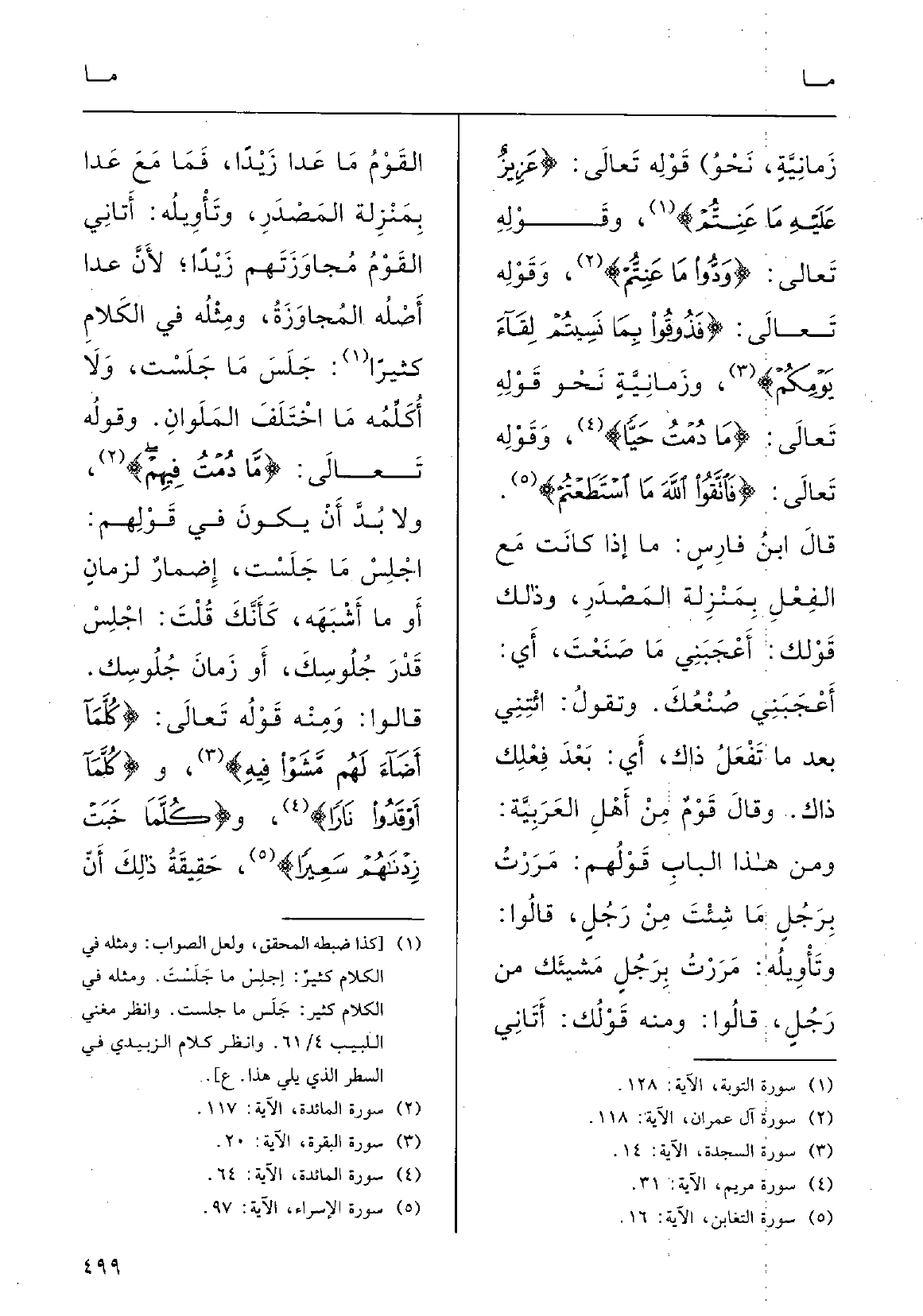 (وزَمانِيَّةً نحوُ) قَوْله تَعَالَى: {مَا دُمْتُ حَيًّا} ، وَقَوله تَعَالَى: {فاتَّقُوا اللهَ مَا اسْتَطَعْتُمْ} ، قَالَ ابنُ فارِس: مَا إِذا كانتْ مَعَ الفِعْل: بِمَنْزِلَةِ المَصْدَر وذلكَ قَوْلك: أَعْجَبَني مَا صَنَعْت، أَي أَعْجَبَني صُنْعَك، وَتقول: ائْتِني بَعْدَما تَفْعَل ذاكَ، أَي بَعْدَ فِعْلِكَ ذاكَ. وقالَ قوْمٌ مِن أَهْلِ العَرَبيَّةِ: ومِن هَذَا البابِ قولُهم: مَرَرْتُ برَجُلٍ مَا شِئْتَ مِن رَجُلٍ، قَالُوا: وتَأْوِيلُه مَرَرْتُ برَجُلٍ مشيئك مِن رَجُلٍ، قَالُوا: وَمِنْه قولُكَ: أَتانِي القَوْمُ مَا عَدا زَيْداً فَمَا مَعَ عَدا بمنْزِلَةِ المَصْدَرِ، وتَأْوِيلُه: أَتانِي القَوْمُ مُجاوَزَتهم زَيْداً لأنَّ عَدا أَصْلُه المُجاوَزَة، مِثْلُه فِي الكَلامِ كَثِيراً جَلَسَ مَا جلَسْت، وَلَا أُكَلّمُه مَا اخْتَلَفَ الملوان؛ وَقَوله تَعَالَى: {، مَا دُمْت فيهم} ، وَلَا بُدَّ أَن يكونَ فِي قَوْلهم اجْلِسْ مَا جَلَسْت إضْمارٌ لزَمانٍ أَو مَا أَشْبَهه، كأنَّك قُلْتَ اجْلِسْ قَدْرَ جلوسِك أَو زَمانَ جلوسِك؛ قَالُوا: وَمِنْه قَوْله تَعَالَى: {كلَّما أَضَاءَ لَهُم مَشوافيه} ، و {كلّما أَوْقَدُوا نَارا} ، و {كلّما خَبَتْ زدْناهُم سَعِيراً} ، حَقِيقَةُ ذلكَ أَنَّ