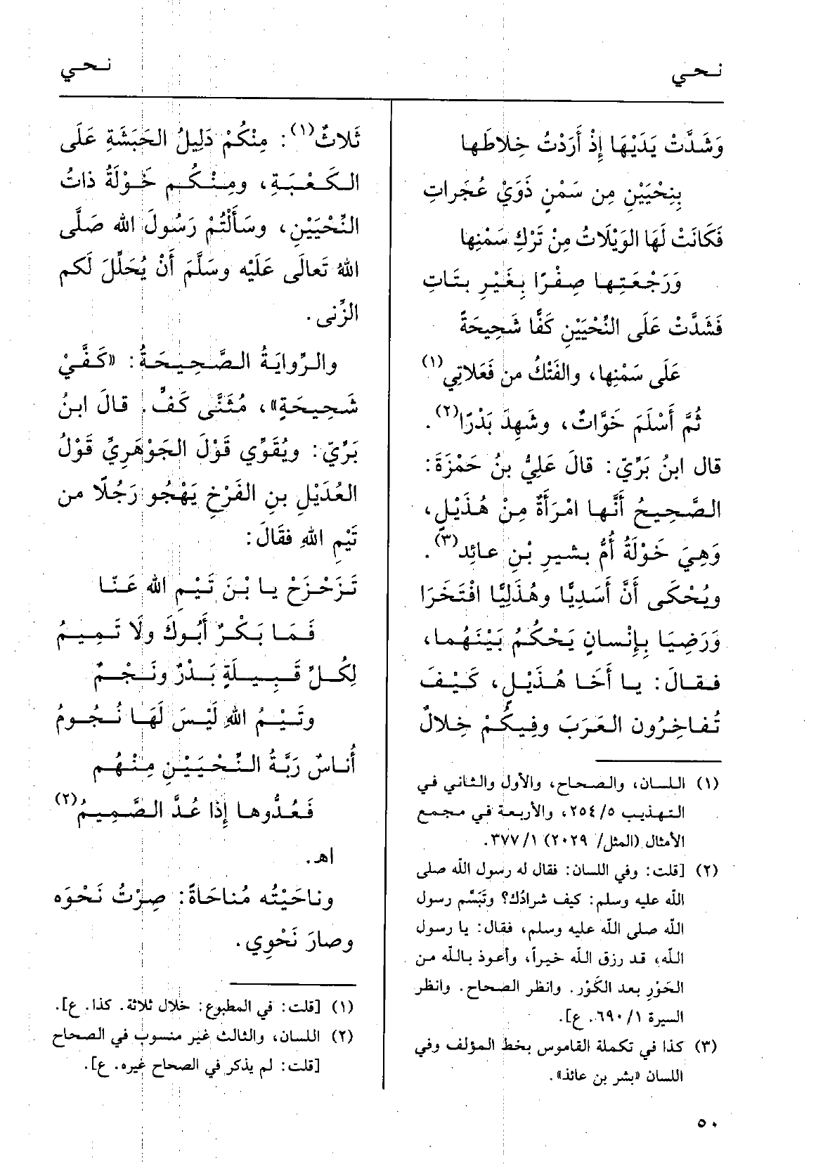 قَالَ ابنُ برِّي: قَالَ عليُّ بنُ حَمْزة: الصَّحيحُ أنَّها امْرأَةٌ مِن هُذَيْل، وَهِي حَوْلَةُ أُمُّ بشِير بن عائِدٍ، ويُحْكَى أنَّ أَسَدِيًّا وهُذَليًّا افْتَخَرَا ورَضِيا بإنْسانٍ يَحْكُم بَيْنهما فَقَالَ: يَا أَخا هُذَيْل كيفَ تُفاخِرُونَ العَرَبَ وَفِيكُمْ خِلالٌ ثَلاثَة: مِنْكُم دَليلُ الحَبَشَةِ على الكَبةِ، ومنكم خَوْلَةُ ذاتُ {النِّحْيين، وسأَلْتُم رَسُولَ اللهاِ، صلى الله عَلَيْهِ وَسلم أَن يُحلِّلَ لكم الزِّنا؛ والرِّوايَةُ الصَّحِيحةُ: كَفَّيْ شَحِيحةٍ. مُثَنَّى كَفّ.