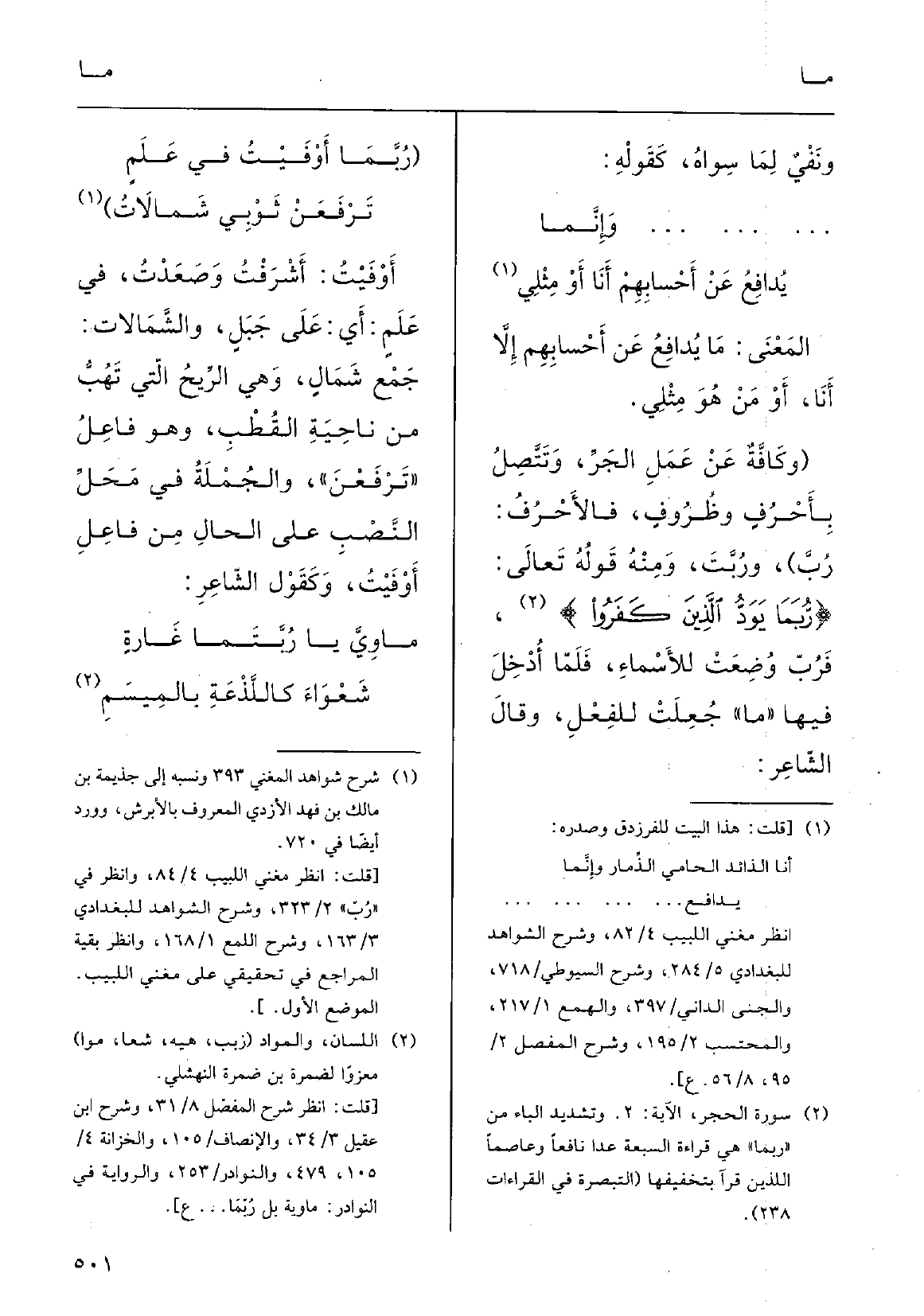 (رُبَّما أوْفَيْتُ فِي عَلَمٍ (تَرْفَعَنْ ثَوْبِي شَمالاتُ) أَوْفَيْتُ: أَشْرَفْتُ وصَعَدْتُ فِي عَلَمٍ أَي على جَبَلٍ، والشَّمالاتُ: جَمْعُ شمالٍ، وَهِي الرِّيحُ الَّتِي تهبُّ من ناحِيَةِ القُطْبِ وَهُوَ فاعِلُ تَرْفَعَنْ، والجُمْلةُ فِي محلِّ النَّصْبِ على الحالِ مِن فاعِلِ أَوْفَيْتُ؛ وكقولِ الشاعرِ: