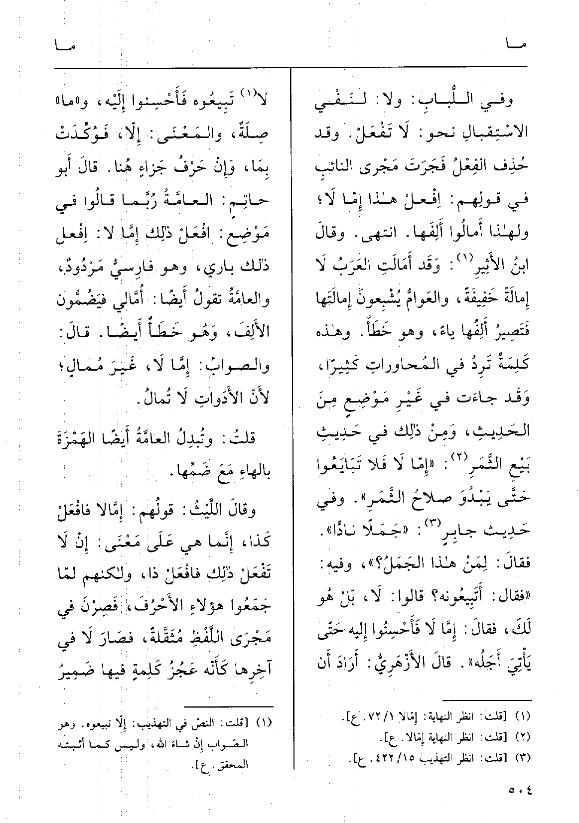 وَفِي اللُّبابِ: وَلَا لنَفْي الاسْتِقْبالِ نَحْو: لَا تَفْعَل، وَقد حُذِفَ الفِعْل فجرَتْ مَجْرَى النَّائِب فِي قوْلِهم: افْعَلْ هَذَا! إمّا لَا وَلِهَذَا أمالُوا أَلِفَها، انتَهَى. وَقَالَ ابنُ الْأَثِير: وَقد أَمالَتِ العَرَبُ لَا إمالَةً خَفِيفَةً، والعَوامُّ يُشْبِعونَ إمالَتَها فتَصِيرُ أَلِفُها يَاء، وَهُوَ خَطَأٌ، وَهَذِه كَلمةٌ تَرِدُ فِي المُحاوَراتِ كَثِيراً، وَقد جاءَتْ فِي غيرِ مَوْضِعٍ مِن الحديثِ، ومِن ذلكَ فِي حديثِ بَيْعِ الثَّمَرِ: (إمَّا لَا فَلَا تَبايَعُوا حَتَّى يَبْدُوَ صَلاحُ الثَّمَرِ) ؛ وَفِي حديثِ جابِرٍ: (رأَى جَمَلاً نادًّا فقالَ: لمَنْ هَذَا الجَمَلُ؟ وَفِيه: فقالَ: أَتبِيعُونَه؟ قَالُوا: لَا بل هُوَ لَكَ، فَقَالَ: إِمَّا لَا فأَحْسِنُوا إِلَيْهِ حَتَّى يَأْتِيَ أَجَلُه) . قَالَ الأزْهري: أَرادَ إنْ لَا تَبِيعُوه فأَحْسِنُوا إِلَيْهِ، وَمَا صِلَةٌ، والمَعْنى: إلاَّ فوُكَّدَتْ بِمَا، وإنْ حَرْفُ جَزاءٍ هُنَا. قَالَ أَبو حاتِمٍ: الْعَامَّة رُبَّما قَالُوا فِي مَوْضِعِ افْعَلْ ذلكَ إِمَّا لَا افْعَلْ ذلكَ بارى، وَهُوَ فارِسِيٌّ مَرْدودٌ، والعامة تقولُ أَيْضاً: أُمَّالي فيَضُمُّونَ الألِفَ، وَهُوَ خَطَأٌ أَيْضاً، قالَ: والصَّوابُ إمَّا لَا غَيْرُ ممالٍ لأنَّ الأدواتَ لَا تُمالُ.