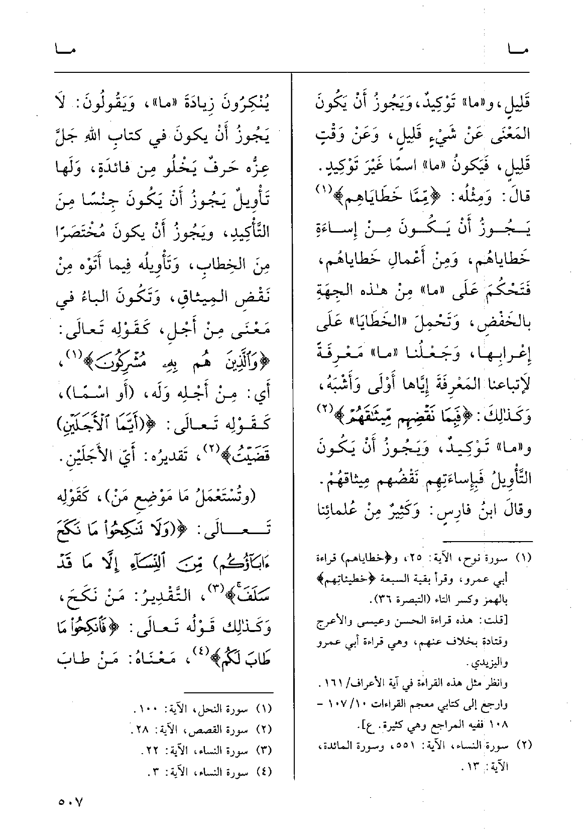 قَلِيلٍ وَمَا تَوْكِيدٌ، ويَجوزُ أَنْ يكونَ المعْنى عَن شيءٍ، قَلِيلٍ وَعَن وَقْتٍ قَلِيلٍ فيكونُ مَا اسْماً غَيْر تَوْكِيدٍ، ومِثْلُه { {ممَّا خَطَاياهُمْ} ، يَجوزُ أَنْ يكونَ مِن إساءَةِ خَطَاياهُمْ ومِن أَعْمال خَطاياهُم، فتحْكُمُ على مَا مِن هَذِه الجِهَةِ بالخَفْضِ، وتحْمِلُ الخَطايَا على إعْرابِها، وجَعَلْنا مَا مَعْرِفَةً لإِتْباعِنا المَعْرِفَةَ إيَّاها أَوْلى وأَشْبَهُ، وكَذلكَ {} فَبِمَا نَقْضِهم مِيثاقَهم} ، وَمَا تَوْكِيدٌ، ويَجوزُ أَنْ يكونَ التَّأْوِيلُ فبِإساءَتِهم نَقْضِهم مِيثاقَهُم. وَقَالَ ابنُ فارِس: وكثيرٌ مِن عُلمائِنا يُنْكِرُونَ زِيادَةَ مَا ويقولونَ لَا يَجوزُ أَنْ يكونَ فِي كتابِ اللهاِ، جلَّ عِزّهُ، حَرْفٌ يَخْلو مِن فائِدَةٍ ولَها تَأْوِيل يَجوزُ أَنْ يكونَ جِنْساً مِن التَّأْكِيدِ، ويَجوزُ أَن يكونَ مُخْتصراً مِن الخِطابِ وتَأْوِيلُه فِبما أَتَوه مِن نَقْضِ المِيثاقِ، وتكونُ الباءُ فِي معْنى مِن أَجْل، كَقَوْلِه تَعَالَى: {وَالَّذين هُم بِهِ مُشْرِكُون} ، أَي مِن أَجْلِه وَله.