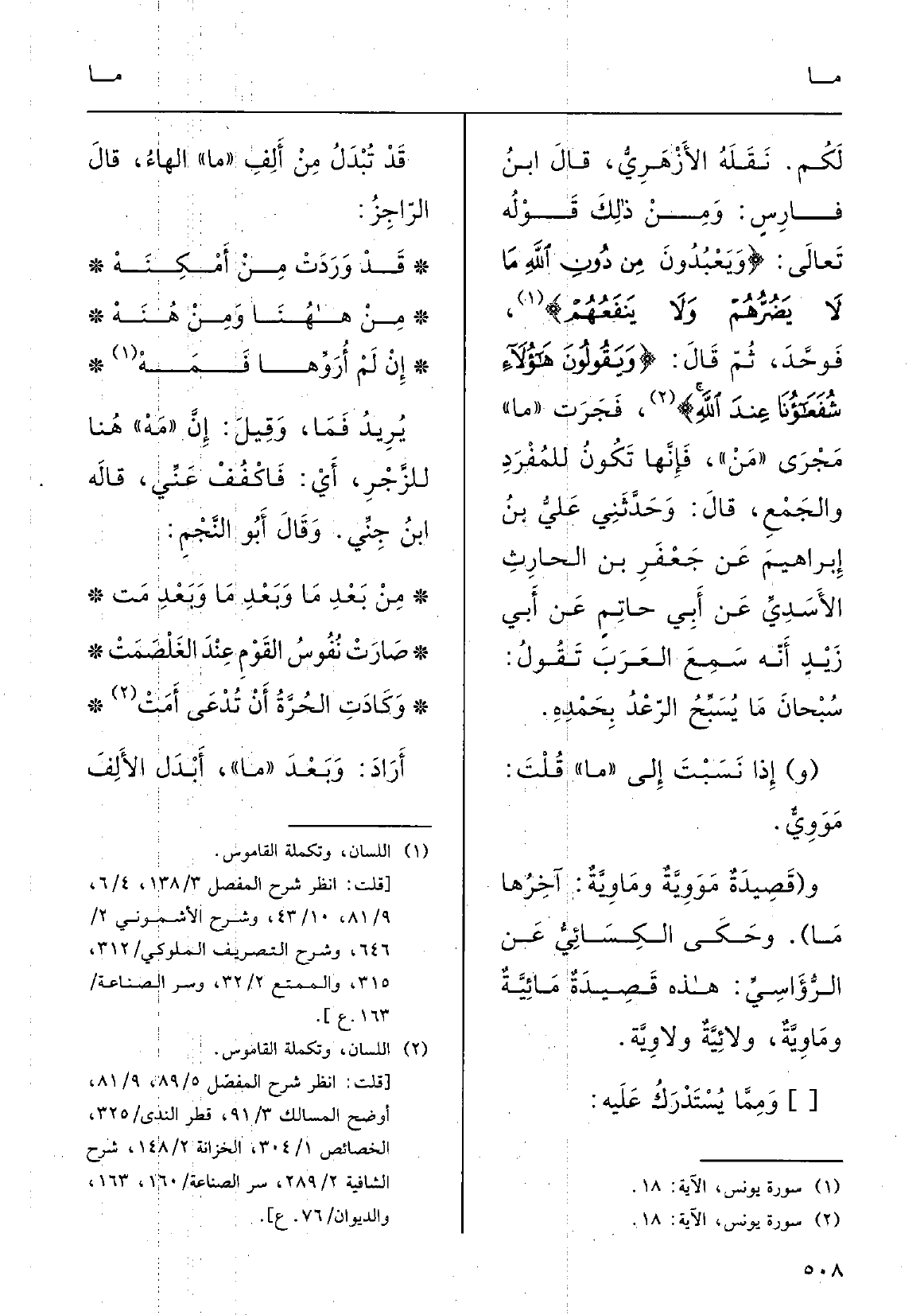 لَكُم؛ نقلَهُ الأزْهري. قَالَ ابنُ فارِس: ومِن ذلكَ قولهُ تَعَالَى: {ويَعْبِدُونَ مِن دُون ااِ مَا لَا يَضرُهم وَلَا يَنْفَعُهم} فَوحد، ثمَّ قَالَ: {وَيَقُولُونَ: هَؤُلاء شُفَعاؤُنا عنْدَ ااِ} ، فجرَتْ مَا مَجْرَى مَنْ فإنَّها تكونُ للمُفْرد والجَمْع، قَالَ: وحدَّثني عليُّ بنُ إِبْرَاهِيم عَن جَعْفرِ بنِ الحارِثِ الأسَدِي عَن أَبي حاتمٍ عَن أبي زيْدٍ أنَّه سَمِعَ العَرَبَ تقولُ: سُبْحانَ مَا يُسَبّح الرَّعْدُ بحَمْدِه.