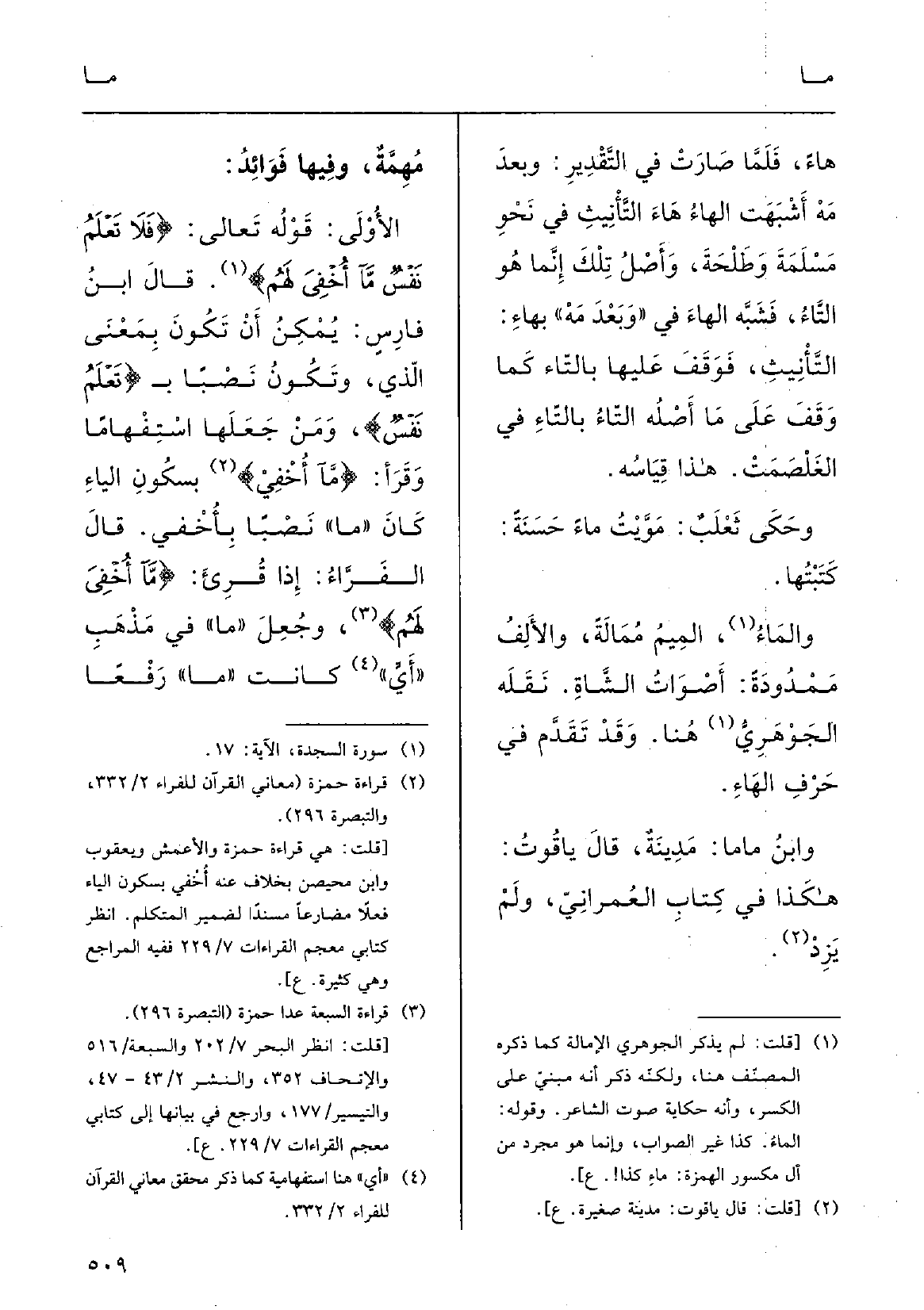 وفيهَا فوائِدٌ: (الأولى:) قولهُ تَعَالَى: {فَلَا تَعْلَم نَفْسٌ مَا أَخْفى لَهُم} ، قَالَ ابنُ فارِس: يمكِنُ أَن تكونَ بمعْنَى الَّذِي وتكونُ نَصْباً بتَعْلَم نَفْسٌ، ومَنْ جَعَلَها اسْتِفْهاماً وقَرَأَ مَا أخْفى بسكونِ الياءِ كانَ مَا نَصْباً بأَخْفى. قَالَ الفرَّاء: إِذا قُرِىءَ مَا أخْفى لَهُم وجُعِل مَا فِي مَذْهَب أَي كانتْ مَا رَفْعاً
