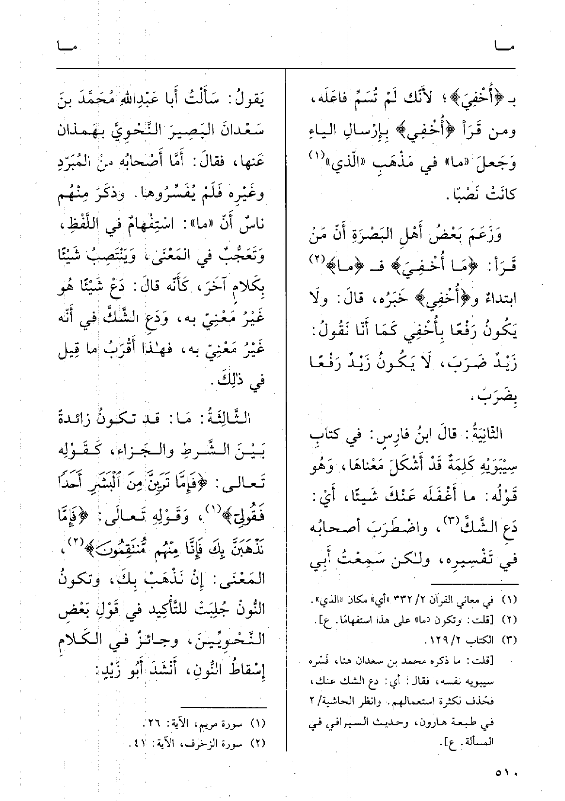 الثَّالثة:) مَا قَدْ تكونُ زائِدَةً بَيْنَ الشَّرْط والجَزاءِ كَقَوْلِه تَعَالَى: {فَأَما تَرين مِنَ البَشَرِ أَحَداً فَقولِي} ، وَقَوله تَعَالَى: {فَأَما نذهَبن بكَ فإنَّا مِنْهُم مُنْتَقِمُون} ، المَعْنى أَن نَذْهَب بكَ، وتكونُ النونُ جُلِبَتْ للتَّأكِيدِ فِي قولِ بعضِ النّحويِّين، وجائِزٌ فِي الكَلامِ إِسْقاطُ النونِ؛ أنْشَدَ أَبو زَيْدٍ: