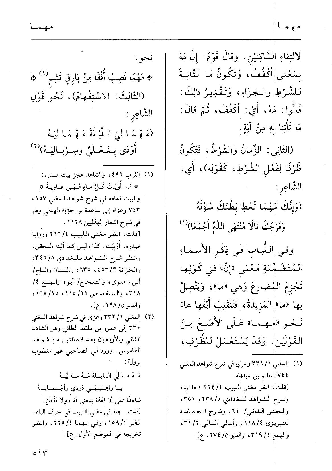 (وإنَّكَ مَهْما تُعْطِ بَطْنَكَ سُؤْلَهُ (وفَرْجَكَ نالا مُنْتَهى الذَّمِّ أَجْمَعا) وَفِي اللّبابِ فِي ذِكْرِ الأسْماءِ المُتَضمِّنَةِ مَعْنى إنْ فِي كَوْنِها تَجْزِم المُضارِع وَهِي مَا ويَتَّصِلُ بهَا مَا المَزِيدَة فتَنْقَلِبُ أَلِفُها هَاء نَحْو: مَهْما على الأَصحِّ مِن القَوْلَيْن، وَقد يُسْتَعْمل للظَّرْف نَحْو: