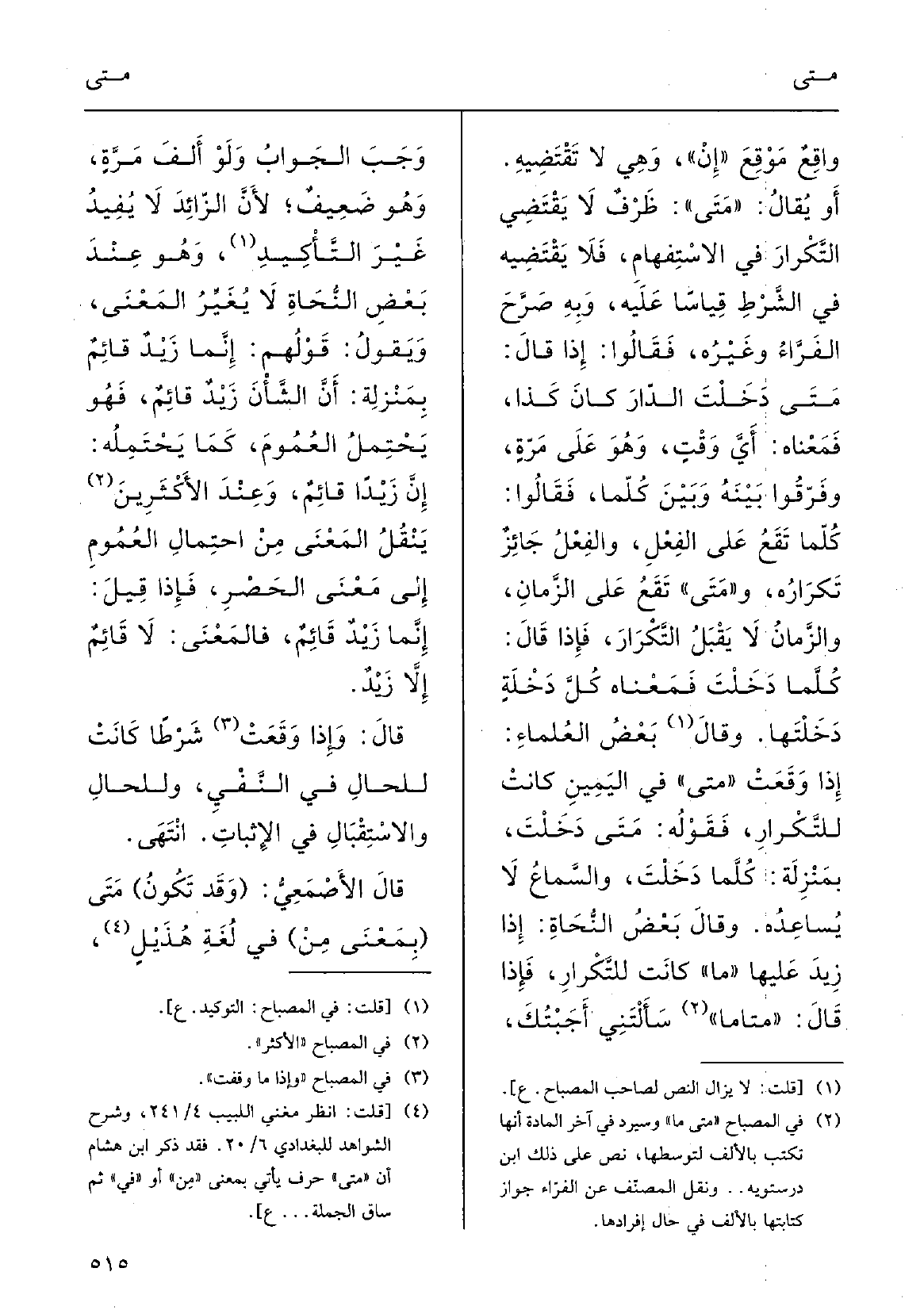 واقِعٌ مَوْقِع إنْ وَهِي لَا تَقْتَضِيهِ، أَو يقالُ: مَتَى ظَرفٌ لَا يَقْتَضِي التِّكْرارَ فِي الاسْتِفْهامِ فَلَا يَقْتَضِيه فِي الشَّرْطِ قِياساً عَلَيْهِ، وَبِه صرَّحَ الفرَّاءُ وغيرُهُ فَقَالُوا: إِذا قَالَ مَتَى دَخَلْت الدَّارَ كَانَ كَذَا، فمعْناهُ أَي وقْتٍ، وَهُوَ على مرَّةٍ، وفرَّقُوا بَيْنه وبينَ كلَّما، فَقَالُوا: كلّما تَقَعُ على الفِعْلِ والفِعْل جائِزٌ تِكْرَاره، ومَتَى تَقَعُ على الزَّمانِ والزَّمانُ لَا يَقْبَل التِّكْرارَ فَإِذا قَالَ كلّما دَخَلْت فمعْناه كلُّ دَخْلةٍ دَخَلْتها. وَقَالَ بعضُ العلماءِ: إِذا وَقَعَتْ مَتَى فِي اليَمِين كانتْ للتِّكْرارِ فَقَوله: مَتَى دَخَلْت بمنْزَلةِ كلَّما دَخَلْت، والسماعُ لَا يُساعِدُه. وَقَالَ بعضُ النُّحاةِ: إِذا زِيدَ عَلَيْهَا مَا كانتْ للتِّكْرارِ، فَإِذا قالَ:! مَتَا مَا سأْلَتَني أَجَبْتُكَ، وَجَبَ الجَوابُ وَلَو أَلْف مَرَّة، وَهُوَ ضَعِيفٌ لأنَّ الزائِدَ لَا يُفِيدُ غَيْر التَّأْكِيد؛ وَهُوَ عنْدَ بعضِ النَّحاةِ لَا يُغَيِّرُ، الْمَعْنى وَيَقُول: قولُهم إنَّما زَيْدٌ قائِمٌ بمنْزِلَةِ أنّ الشّأْن زَيْدٌ قائِمٌ فَهُوَ يَحْتَمِلُ العُمُومَ كَمَا يَحْتَمِله إنَّ زيْداً قائِمٌ وعنْدَ الأكْثَرين يَنْقُلُ المَعْنى مِن احْتِمالِ العُمُومِ إِلَى مَعْنى الحَصْر، فَإِذا قيل: إنَّما زَيْدٌ قائِمٌ، فالمَعْنى لَا قائِم إلاَّ زَيْد، قَالَ: وَإِذا وَقَعَتْ شَرْطاً كانتْ للحالِ فِي النَّفْي، وللحالِ والاسْتِقْبالِ فِي الإثْباتِ، انتَهَى.