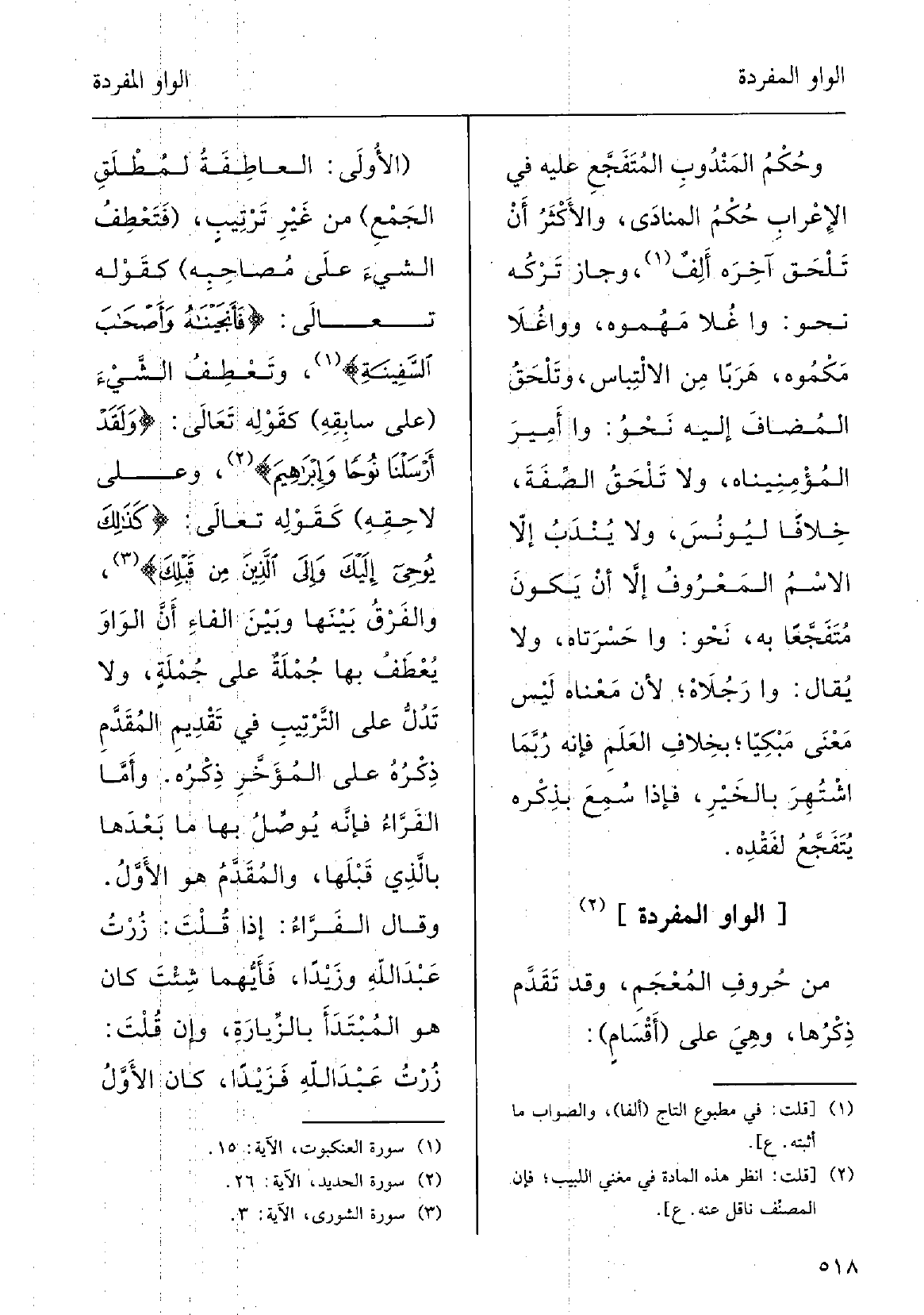 (الأُولَى: العاطِفَةُ لمُطْلَقِ الجَمْع) مِن غيرِ تَرْتيبٍ (فَتَعْطِفُ الشَّيءَ على مصاحِبِه) كَقَوْلِه تَعَالَى: {فأَنْجَيْناهُ وأَصْحابَ السَّفينةِ} ، و) تَعْطِفُ الشَّيءَ (على سابِقِه) كَقَوْلِه تَعَالَى: {وَلَقَد أَرْسَلْنا نُوحاً وإبراهيمَ} ؛ وعَلى لاحِقِه) كَقَوْلِه تَعَالَى: {كَذلكَ يُوحِي إِلَيْك وَإِلَى الذينَ مِن قَبْلِكَ} . والفَرْقُ بَيْنها وبَيْنَ الفاءِ أنَّ الواوَ يُعْطَفُ بهَا جُمْلَةٌ وَلَا تدلُّ على التَّرْتيبِ فِي تَقْدِيمِ المُقَدّم ذِكْره على المُؤَخّرِ ذِكْره، وأَمَّا الفرَّاء فإنَّه يُوصِلُ بهَا مَا بَعْدَها بِالَّذِي قَبْلها والمُقدّمُ الأَوَّل، وَقَالَ الفرَّاء: إِذا قلْت زُرْتُ عَبْدَ اللهِ وزَيْداً فأيّهما شِئْتَ كَانَ هُوَ المُبْتَدَأ بالزِّيارَةِ، وإنْ قلْت زُرْتُ عَبْدَ اللهِ فزَيْداً كانَ الأوَّل
