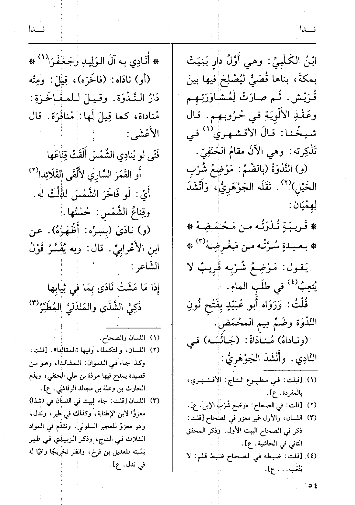 {أُنادِي بِهِ آلَ الوَلِيدِ وجَعْفَرا أَو) } نادَاهُ: (فاخَرَهُ) ، قيلَ: وَمِنْه دارُ النَّدْوَةِ؛ وقيلَ للمُفاخَرَةِ: {مُنادَاة، كَمَا قيلَ لَهَا مُنافَرَةٌ؛ قالَ الأعْشى: