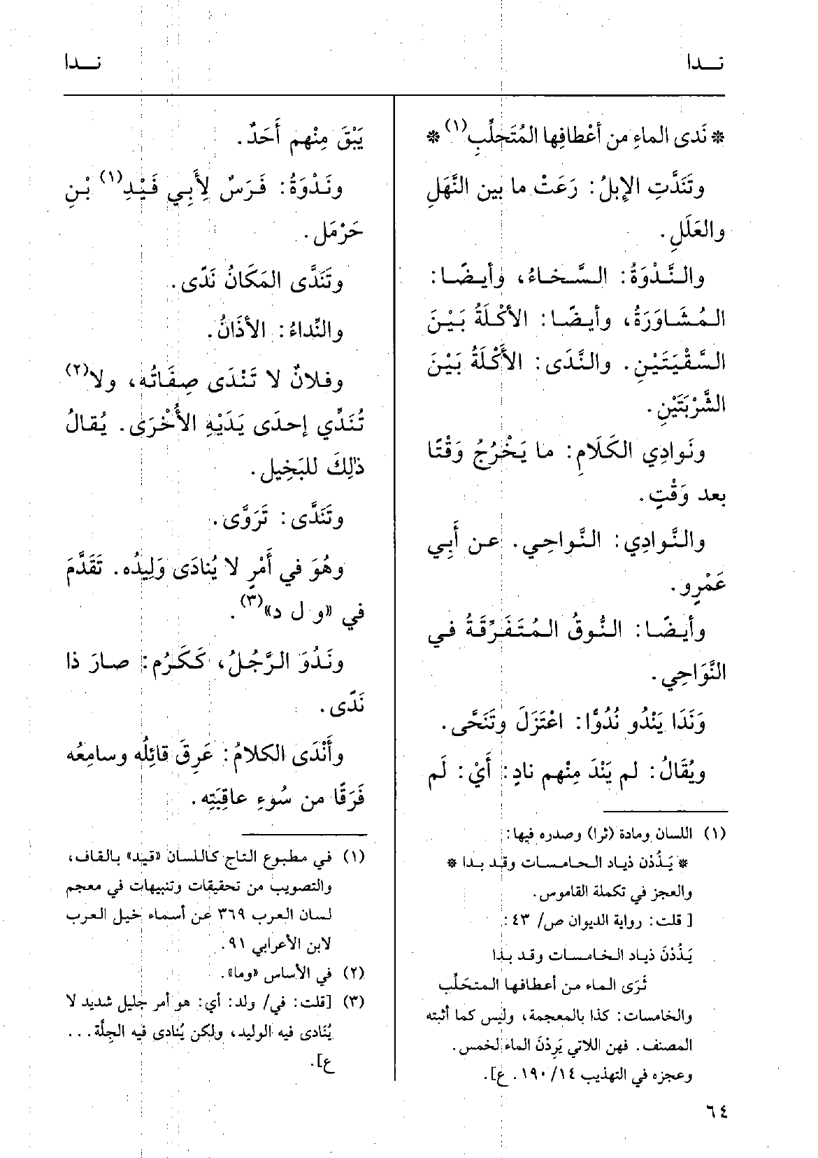 نَدَى الماءِ مَنْ أعْطافِها المُتَحَلِّب وتَنَدَّتِ الإِبِلُ: رَعَتْ مَا بينَ النَّهَل والعَلَلِ.