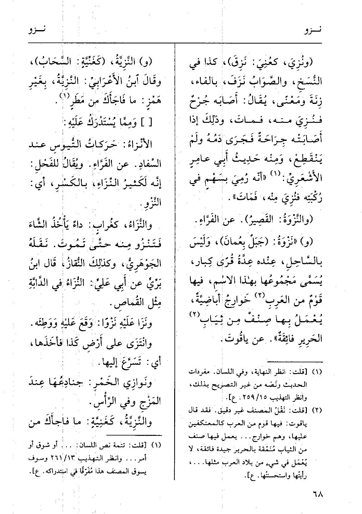 ( {ونُزِيَ، كعُنِي: نَزِقَ) ؛ كَذَا فِي النسخِ والصَّوابُ نُزِفَ بالفاءِ زنَةً ومعْنى. يقالُ: أَصابَهُ جُرحٌ} فنُزِيَ مِنْهُ فماتَ، وذلكَ إِذا أَصابَتْه جِراحَةٌ فجرَى دَمُه وَلم يَنْقَطِعْ. وَمِنْه حديثُ أَبي عامِرٍ الأشْعري: (أَنه رُمِيَ بسَهْمٍ فِي رُكْبتِه فنُزِيَ مِنْهُ فماتَ) .