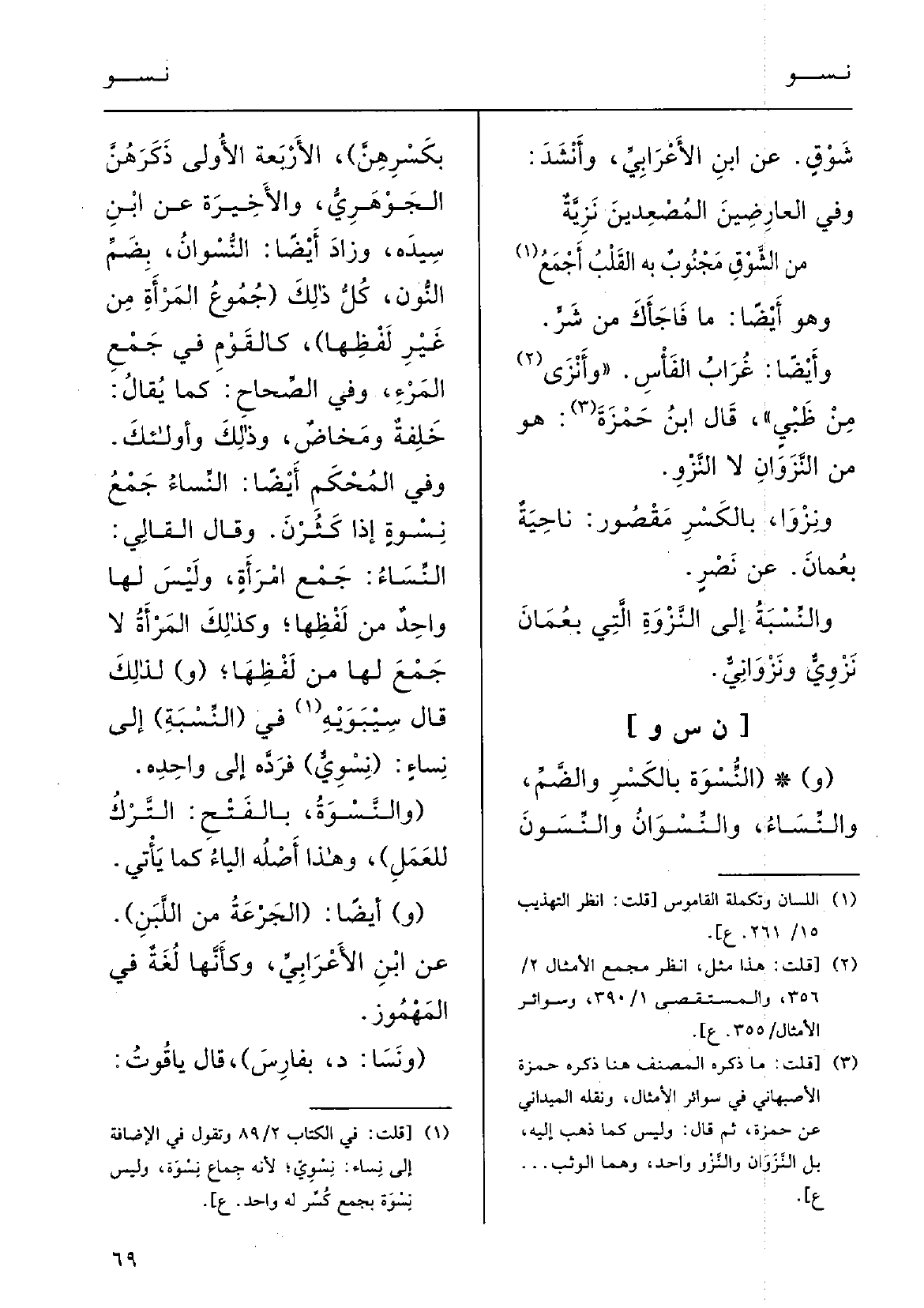: (و (} الِنُّسْوَةُ، بِالْكَسْرِ والضَّمِّ، {والنِّساءُ} والنِّسْوانُ {والنِّسَونَ، بكَسْرهنَّ) ، الأرْبَعةُ الأولى ذَكَرهنَّ الجَوْهرِي، والأخيرَةُ عَن ابنِ سِيدَه، وزادَ أيْضاً} النُّسْوانُ بِضَم النونِ: كلُّ ذلكَ (جُموعُ المرْأَةِ من غيرِ لَفْظِها) ؛ كالقَوْمِ فِي جَمْعِ المَرْءِ.