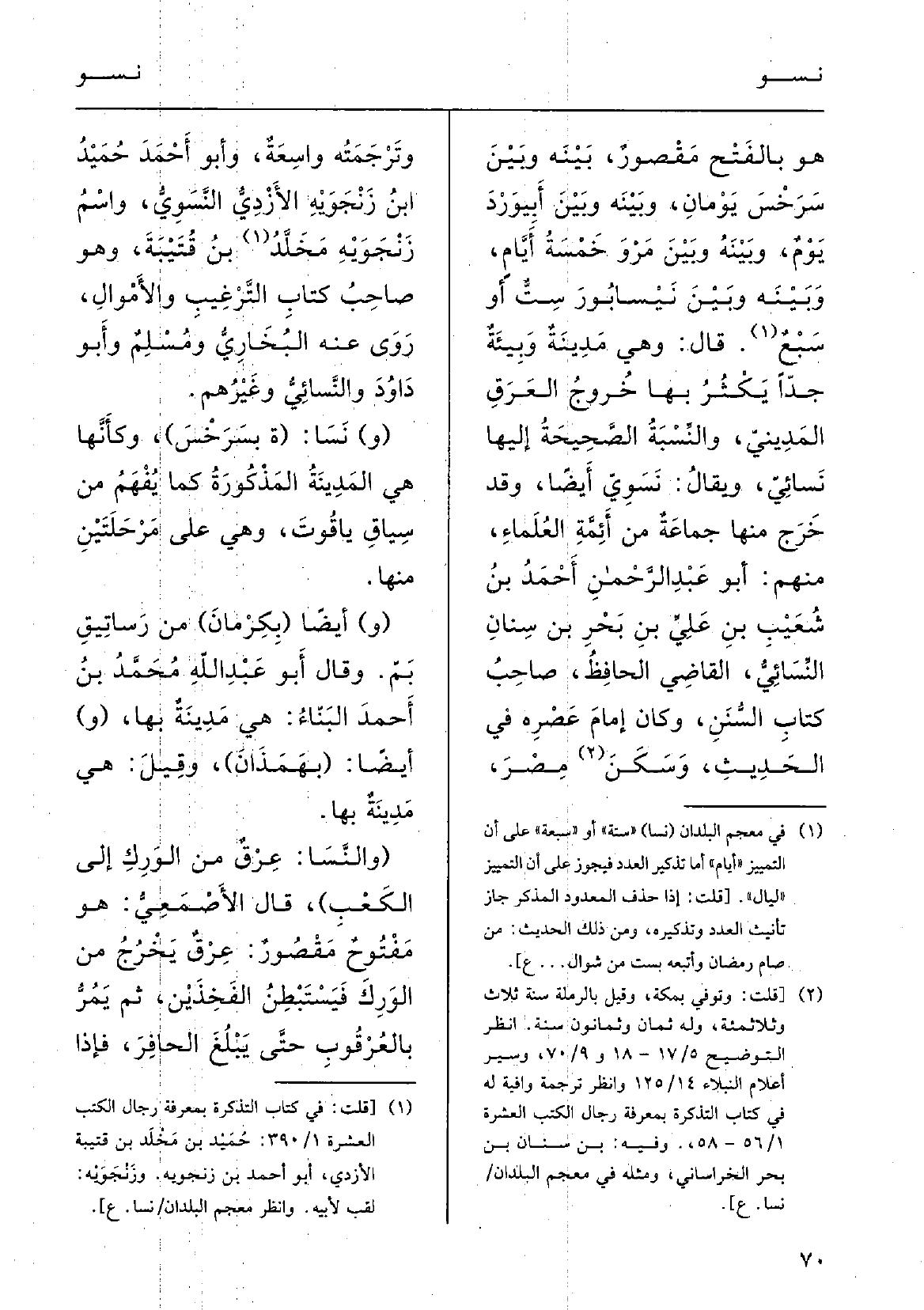 هُوَ بالفَتْح مَقْصورٌ بَيْنه وبينَ سرخس يَوْمان، وبَيْنه وَبَين، أبيورد يَوْم، وبَيْنه وبَيْنَ مَرْو خَمْسَة أَيامٍ، وبَيْنه وبَيْنَ نَيْسابُورسِتّ أَو سَبْع؛ قالَ: وَهِي مدينَةٌ وَبِيئةٌ جِدًّا يَكْثرُ بهَا خُرُوجُ العرقِ المَدِيني، والنِّسْبَةُ الصَّحيحةُ إِلَيْهَا {نَسَائِي، ويقالُ} نَسَوِيٌّ أَيْضاً؛ وَقد خَرَجَ مِنْهَا جماعَةٌ مِن أَئِمَّة العُلَماء مِنْهُم: أَبُو عبدِ الرحمنِ أَحمدُ بنُ شُعَيْب بنِ عليِّ بنِ بَحْر بنِ سِنانِ النّسائيُّ القاضِي الحافِظُ صاحِبُ كتابِ السّننِ، وكانَ إمامَ عَصْرِه فِي الحديثِ، وسَكَنَ مِصْرَ، وترْجَمَتهُ واسِعَةٌ. وَأَبُو أَحمدَ حميدُ بنُ زِنجوَيه الأزْدِي {النَّسويُّ، واسْمُ زِنْجَوَيه مخلدُ ابنُ قتيبَةَ وَهُوَ صاحِبُ كتابِ التَّرْغِيبِ، والأَمْوال، رَوَى عَنهُ البارِي ومُسْلم وأبَو داودَ النّسائي وغيرُهُم.