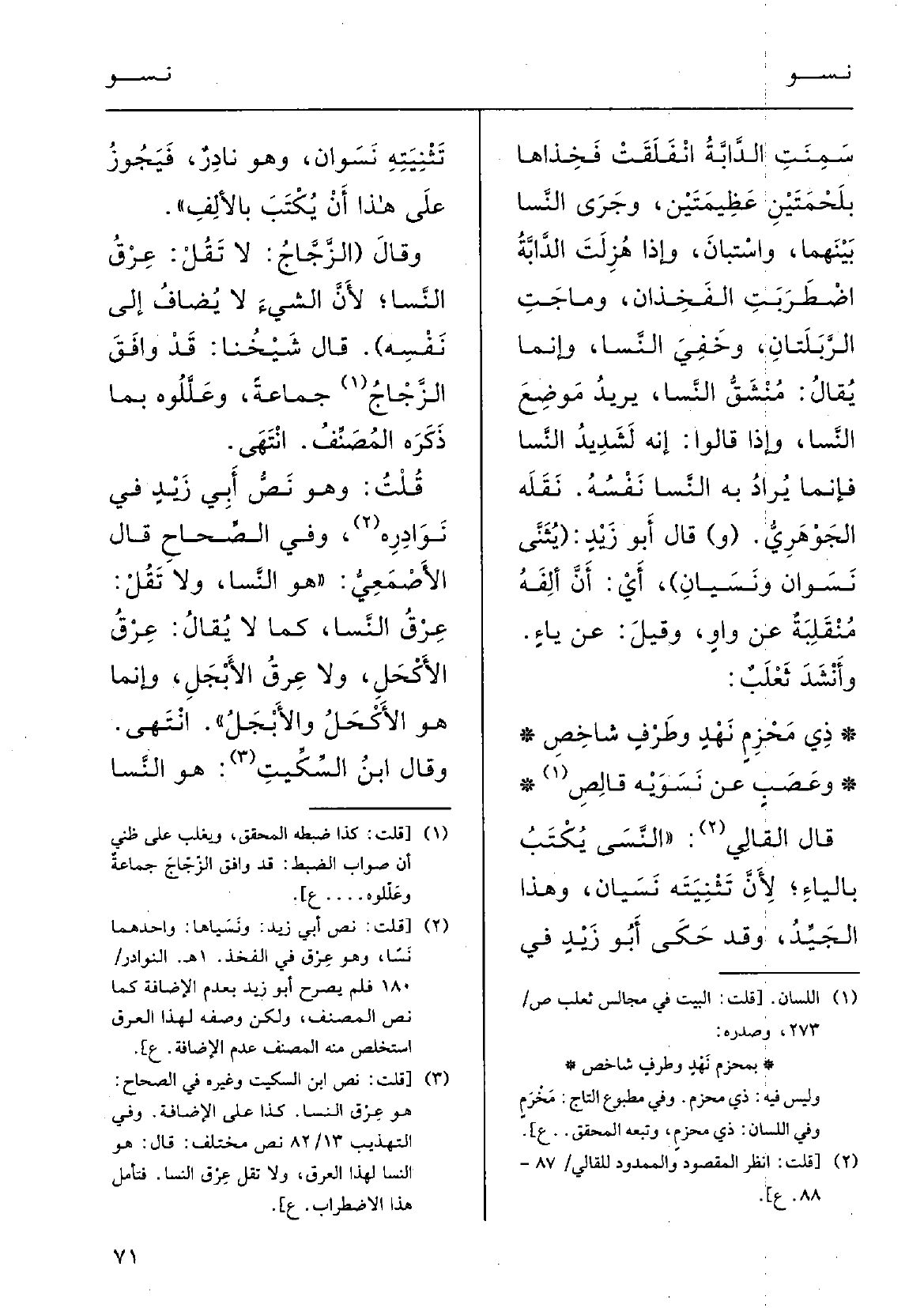وعَصَبٍ عَنْ} نَسَوَيْهِ قالِصِ قَالَ القالِي:! النَّسَى يُكْتَبُ بالياءِ لأنَّ تَثْنيتَهُ نَسَيان، وَهَذَا الْجيد. وَقد حكَى أَبُو زيْدٍ فِي تَثْنيتِه نَسَوانِ وَهُوَ نادِرٌ، فيجوزُ على هَذَا أَن يُكْتَبَ بالألِفِ.