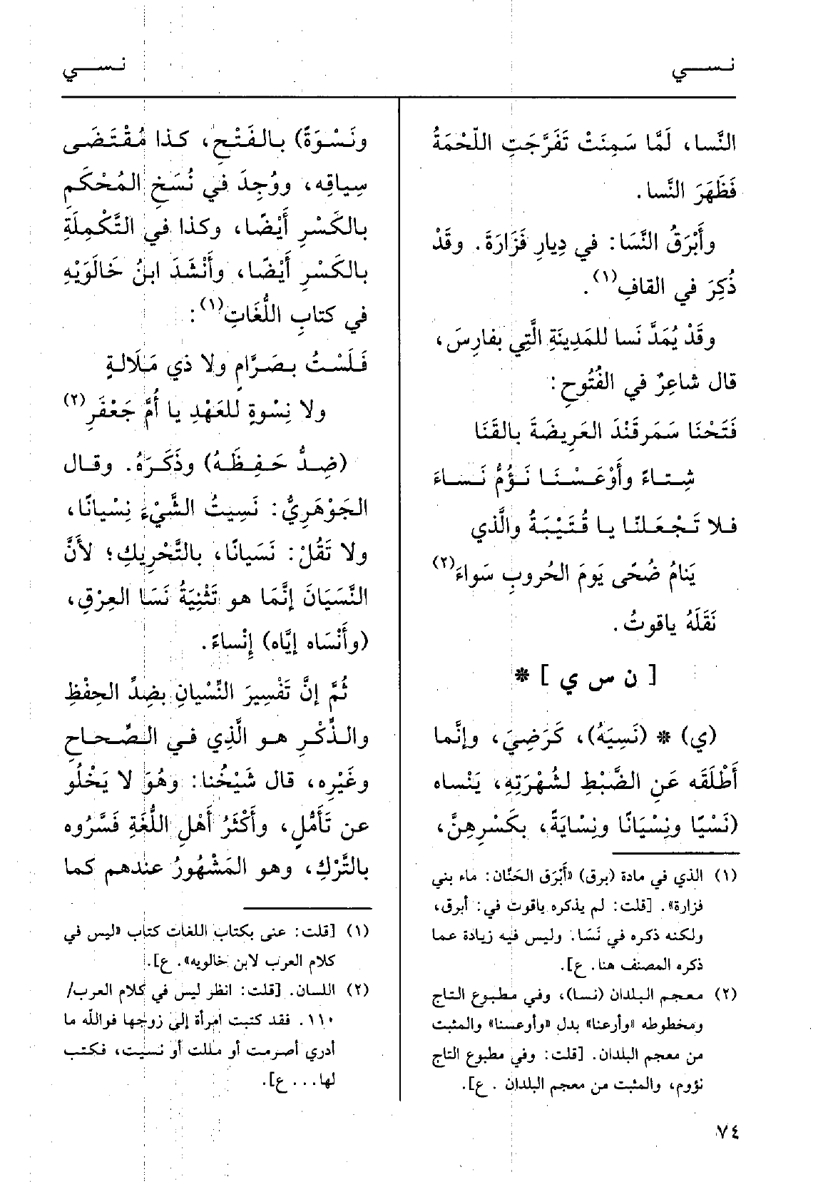 : (ي} نَسِيَهُ) ، كرَضِيَ؛ وإنَّما أَطْلَقه عَن الضَّبْط لشُهْرتِه؛ {يَنْساه (} نَسْياً {ونِسْياناً} ونِسايَةً، بكسْرهنَّ، {ونَسْوَةً) ، بِالْفَتْح، كَذَا مُقْتضَى سِياقِه؛ ووُجِدَ فِي نسخ، المُحْكم بالكَسْر أَيْضاً، وَكَذَا فِي التكْملَةِ بالكَسْر أَيْضاً، وأنْشَدَ ابنُ خَالَويه فِي كتابِ اللغاتِ: