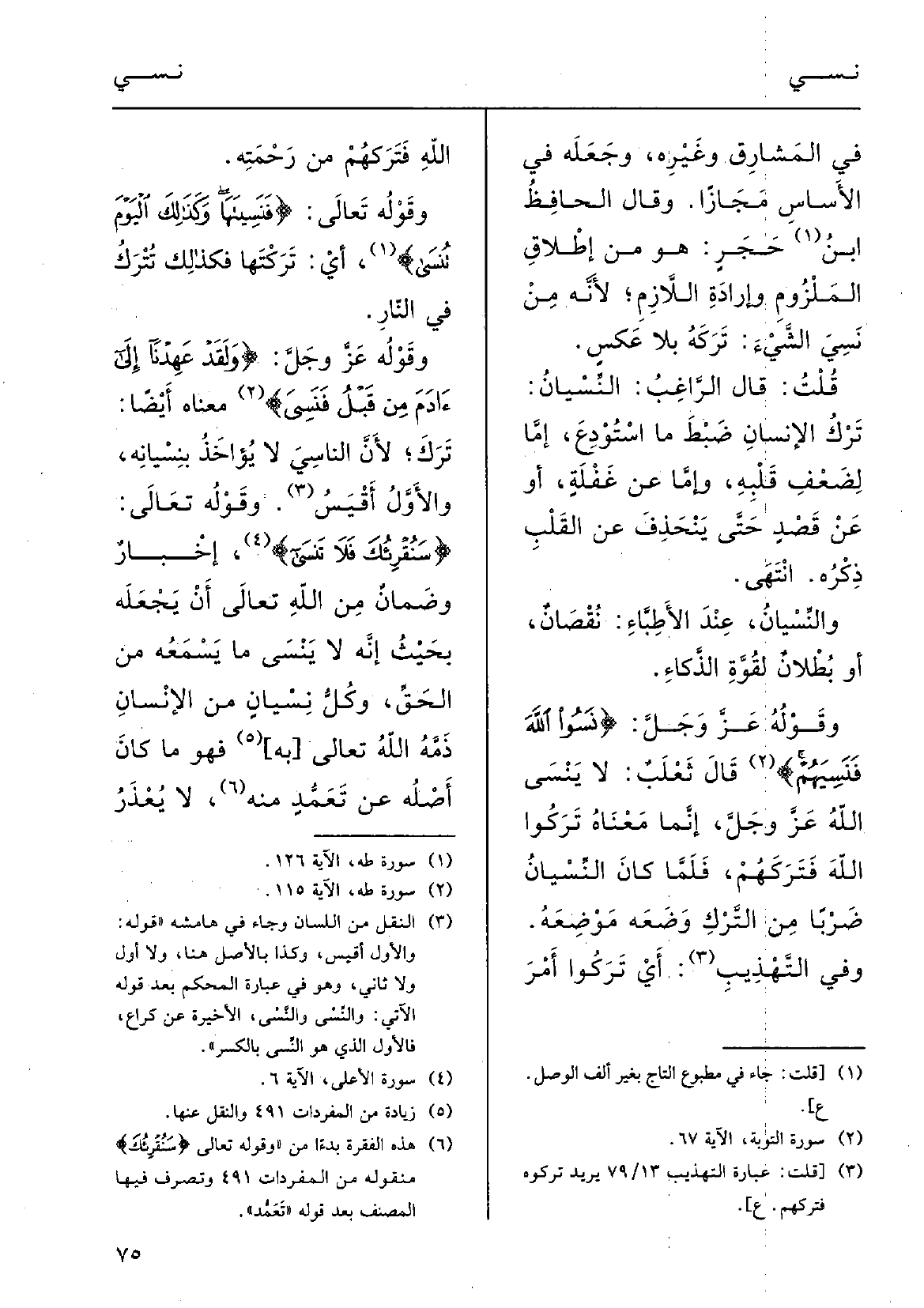قُلْت: قالَ الرَّاغبُ: النِّسْيانُ: تَرْكُ الإِنْسانِ ضَبْط مَا اسْتُوْدِعَ إمَّا لضَعْفِ قَلْبِه وإمَّا عَن غَفْلةٍ أَو عَن قَصْدٍ حَتَّى يَنْحذفَ عَن القَلْبِ ذِكْرُه، انتَهَى.