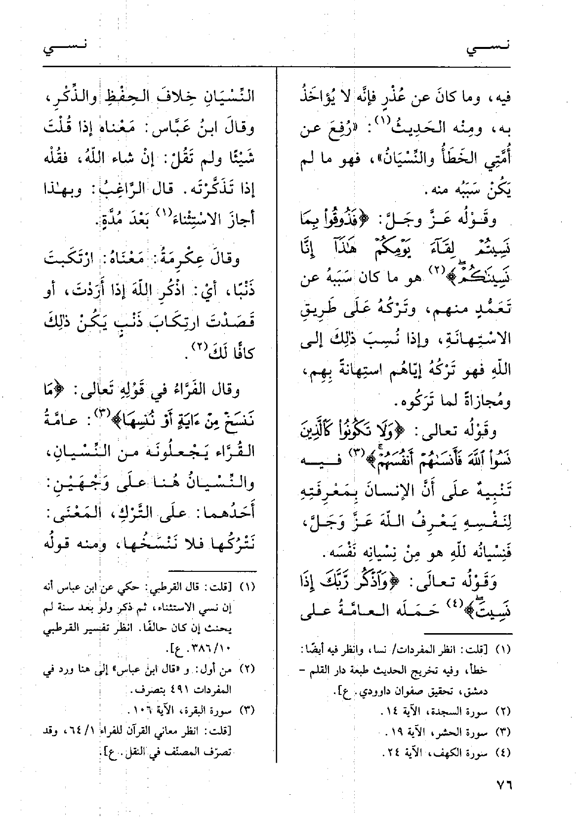 فِيهِ، وَمَا كانَ عَن عُذْرٍ فإنَّه لَا يُؤاخَذُ بِهِ؛ وَمِنْه الحديثُ: (رفِعَ عَن أُمَّتِي الخَطَأ {والنِّسْيان) ، فَهُوَ مَا لم يَكُنْ سَبَبه مِنْهُ؛ وقولُه، عزَّ وجلَّ: {فذُوقُوا بِمَا} نَسِيتُم لِقاءَ يَوْمكم هَذَا إنّا {نسيناكم} هُوَ مَا كانَ سَبَيه عَن تَعَمُّدٍ مِنْهُم، وتَركه على طرِيقِ الاسْتِهانَةِ، وَإِذا نسبَ ذلكَ إِلَى اللهاِ فَهُوَ تَركه إيَّاهم اسْتِهانَةً بهم ومُجازَاةً لمَا تَرَكُوه.