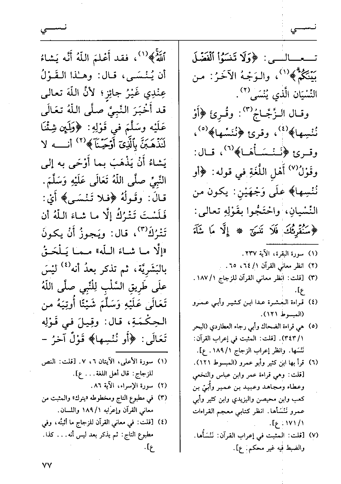 وَقَالَ الزجَّاج: وقُرِىءَ: أَو نُنْسِها، وقُرِىءَ: {نُنَسِّها، وقُرِىء، نَنْسَأَها، قالَ: وقولُ أَهْل اللغَةِ فِي قولهِ أَو نُنْسِها على وَجْهَيْنِ: يكونُ مِن النِّسْيان واحْتَجُوا بقولهِ تَعَالَى: {سَنُقْرِئك فَلَا} تَنْسَى إِلَّا مَا شاءَ ا} ، فقد أَعْلَم اللهاُ أَنَّه يَشاءُ أَن! يَنْسَى، قالَ: وَهَذَا القولُ عنْدِي غيْرُ جائِزٍ، لأنَّ اللهاَ تَعَالَى قد أَخْبَر النبيَّ، صلى الله عَلَيْهِ وَسلم فِي قولِه: {ولئِنْ شِئْنا لنَذْهَبَنَّ بِالَّذِي أَوْحَيْنا} ، أنَّه لَا يَشاءُ أَن يَذْهَبَ بِمَا أَوْحَى بِهِ إِلَى النبيِّ، صلى الله عَلَيْهِ وَسلم قالَ) وقولهُ: {فَلَا تَنْسى} ، أَي فلسْتَ تَتْرُك إلاَّ مَا شاءَ اللهاُ أَن يَتْرُك، قالَ: ويجوزُ أَن يكونَ إلاَّ مَا شاءَ اللهاُ ممَّا يَلْحَق بالبَشَرِيَّة ثمَّ يَذْكُر بعْدُ ليسَ أنَّه على طرِيقِ السّلْب للنبيِّ، صلى الله عَلَيْهِ وسلمشيئاً أُوتِيَه مِن الحِكْمةِ، قالَ: وَقيل فِي قولهِ تَعَالَى: {أَو نُنْسِها} قولٌ آخَرُ،
