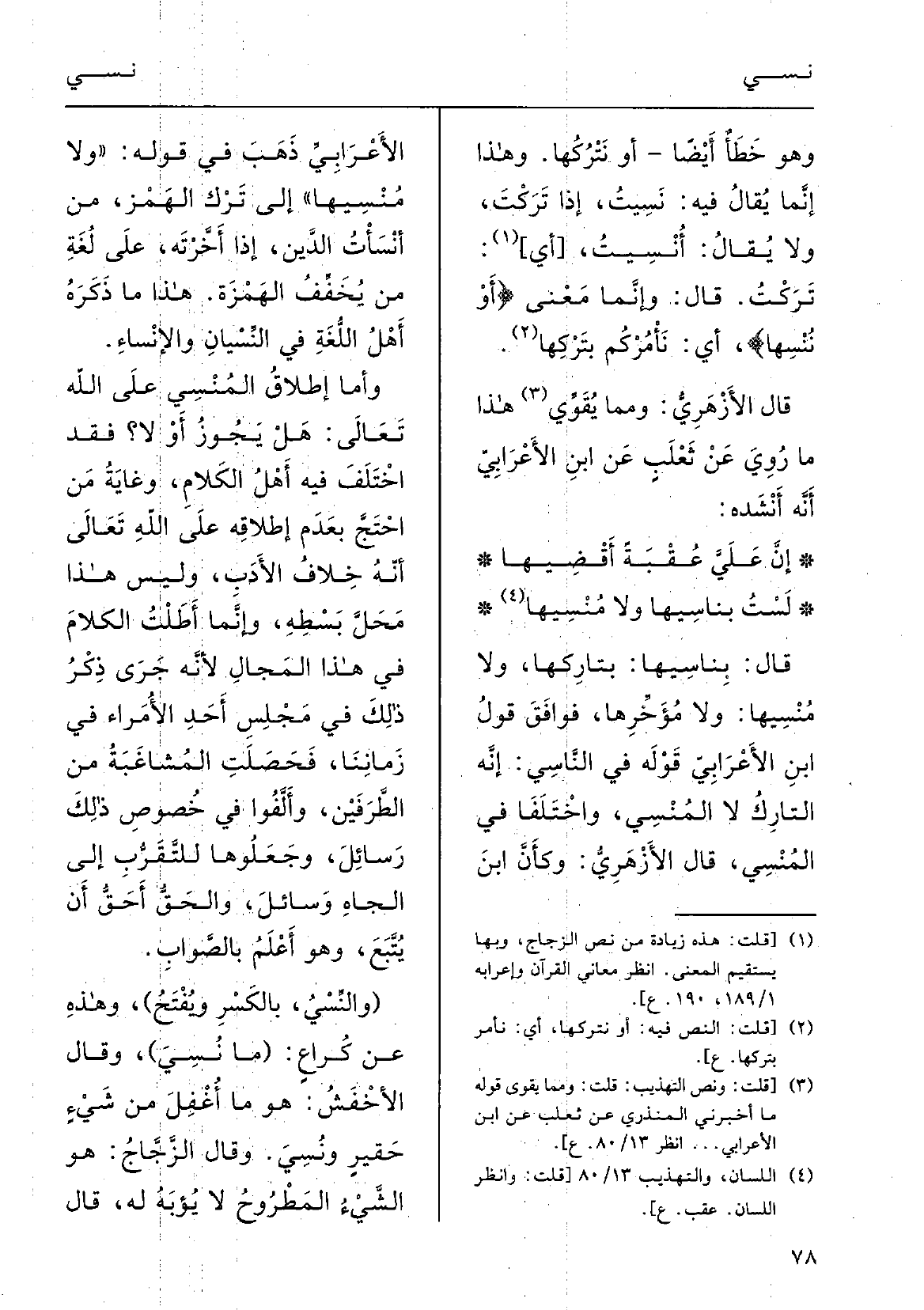 قالَ الأزْهرِي: وكأنَّ ابنَ الأعْرابي ذَهَبَ فِي قولِه: وَلَا مُنْسِيها إِلَى تَرْكِ الهَمْز مِن أَنْسَأْتُ الدَّيْن إِذا أَخَّرْته، على لُغَةِ مَنْ يُخَفِّفُ الهَمْزةَ.