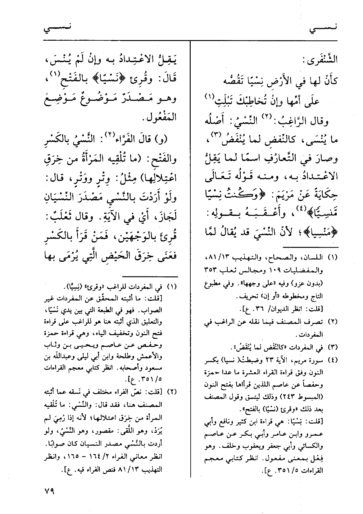 على أمِّها أَو إِن تُخاطِبْكَ تَبْلَت ِوقال الرَّاغبُ:} النِّسْيُ أَصْلُه مَا {يُنْسَى كالنّقْض لمَا يُنْقَضُ، وصارَ فِي التَّعارُفِ اسْماً لمَا يقل الاعْتِدادُ بِهِ، وَمِنْه قولهُ تَعَالَى حِكايَةً عَن مَرْيم: {وكُنْت} نِسْياً {مَنْسِيًّا} ، وأَعْقَبَه بقولِه: مَنْسِيّا لأنَّ النِّسْيَ قد يقالُ لمَا يقل الاعْتِدادُ بِهِ وَإِن لم} يُنْسَ، قالَ: وقُرِىءَ {نَسْياً، بالفَتْح، وَهُوَ مَصْدَرٌ مَوْضوعٌ مَوْضِع المَفْعول.