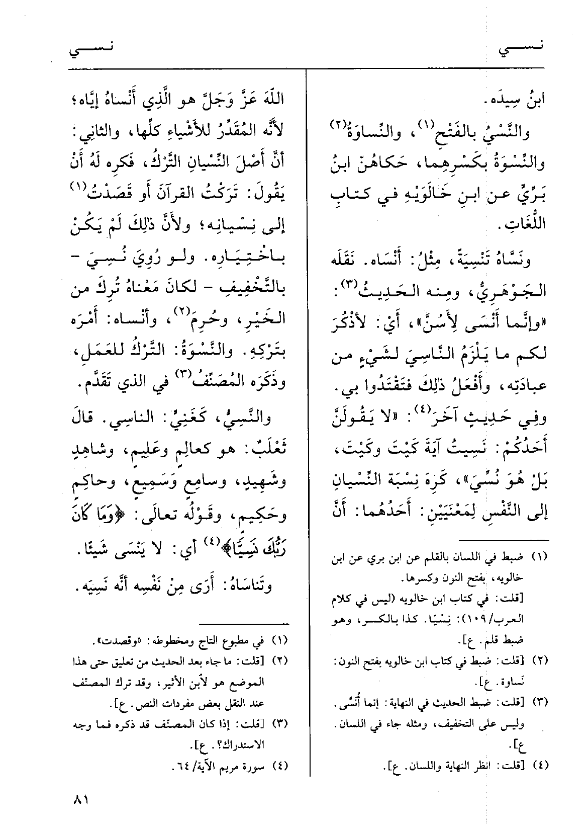 وَفِي حديثٍ آخر: (لَا يَقُولَنَّ أَحَدُكم {نَسِيتُ آيةَ كَيْتَ وكَيْتَ، بل هُوَ} نُسِّيَ) ، كَرِهَ نِسْبةَ {النِّسْيانِ إِلَى النفْسِ لمعْنَيَيْنِ: أَحَدُهما أَنَّ اللهاَ، عزَّ وجلَّ، هُوَ الَّذِي} أَنْساهُ إيَّاه لأنَّه المقدِّرُ للأشْياءِ كُلِّها، وَالثَّانِي: أنَّ أَصْلَ {النِّسْيان التَّركُ فكَرِهَ لَهُ أَنْ يقولَ تَرَكْتُ القُرْآن، وقَصَدْتُ إِلَى} نِسْيانِه ولأنَّ ذلكَ لم يكُنْ باخْتِيارِه؛ وَلَو رُوِيَ: {نُسِيَ بالتَّخفيفِ لكانَ مَعْناه تُرِكَ مِن الخَيْرِ وحُرِمَ.