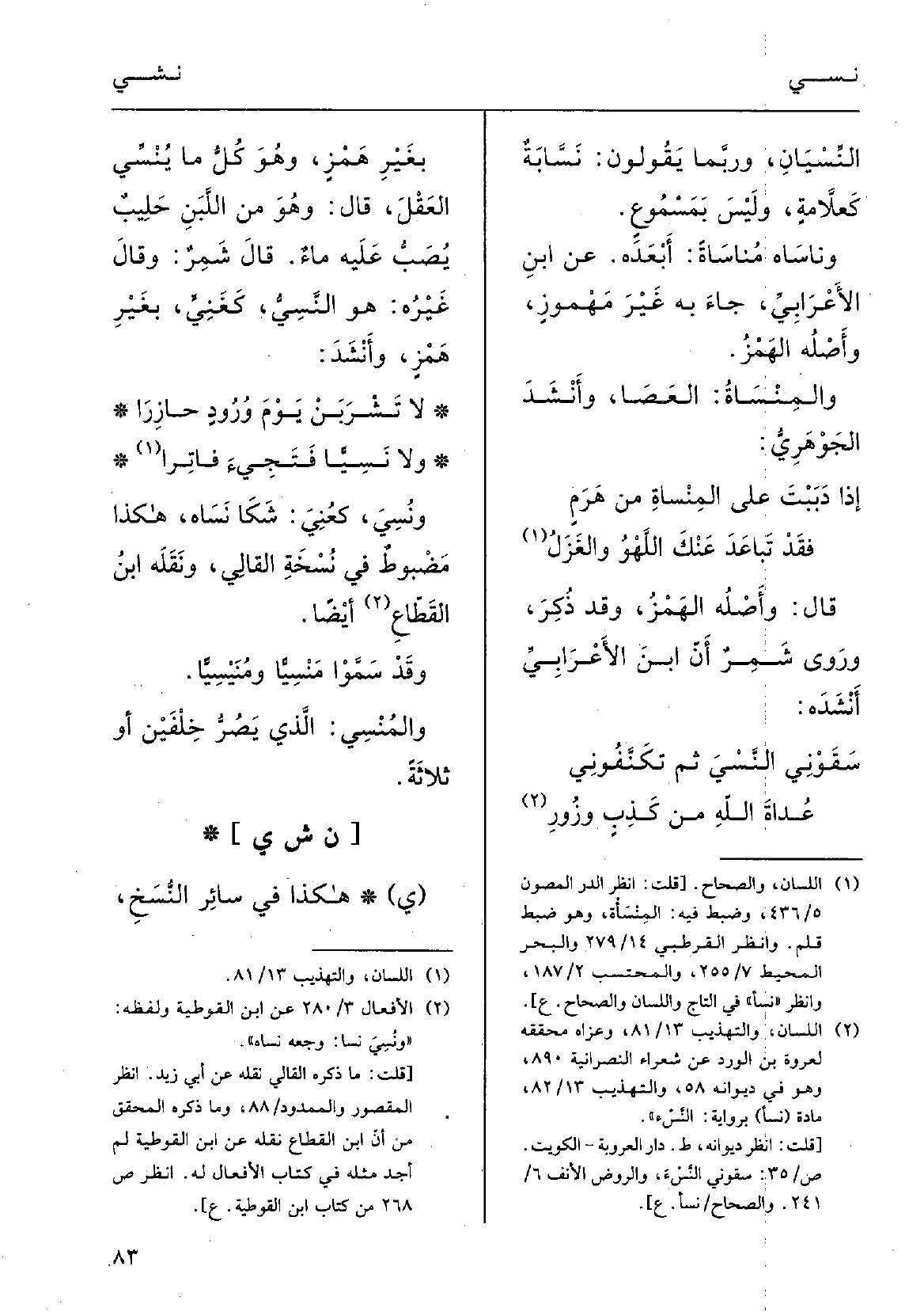 عُداةَ اللهاِ من كَذِبٍ وزُورِبغيرِ هَمْزٍ، وَهُوَ كلُّ مَا {ينسى العَقْل، قالَ: وَهُوَ مِن اللّبَنِ حَلِيب يُصَبُّ عَلَيْهِ ماءٌ؛ قَالَ شَمِرٌ: وقالَ غيرُهُ: هُوَ} النَّسِيُّ، كغَنِيَ، بغيرِ هَمْز وأَنْشَدَ: