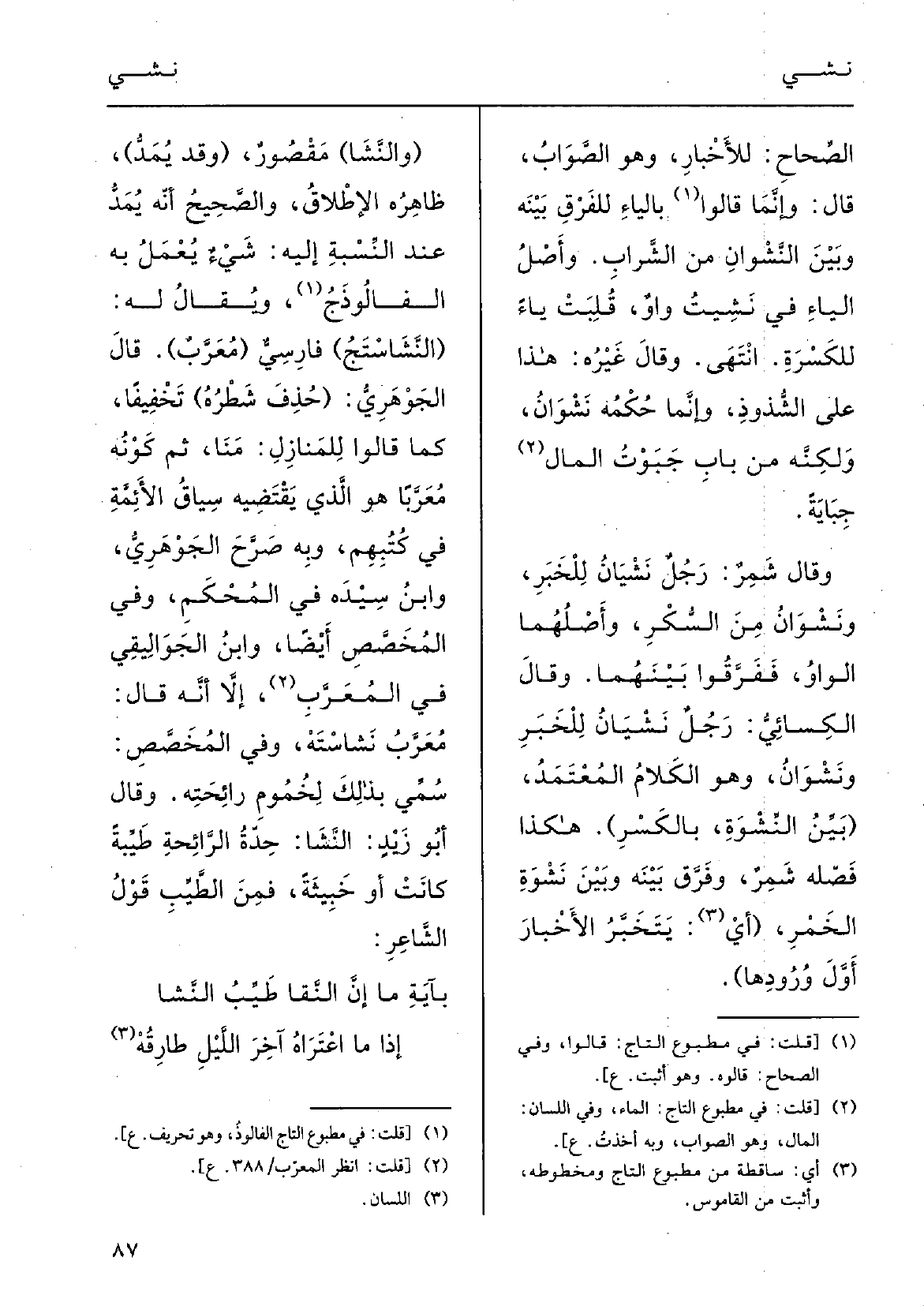الصِّحاح: للأَخْبارِ وَهُوَ الصَّوابُ، قالَ: وإنَّما قَالُوا بالياءِ للفَرْقِ بَيْنه وبَيْنَ النَّشْوانِ مِن الشَّرابِ، وأَصْلُ الياءِ فِي نَشِيت وَاو قُلِبَت يَاء للكَسْرةِ انتَهَى. وقالَ غَيْرُه هَذَا على الشّذوذِ وإنَّما حكْمُه {نَشْوان، ولكنَّه مِن بابِ جَبَوْت الماءَ جبايَةً؛ وَقَالَ شمِرٌ: رجُلٌ نَشْيانُ للخَبَرِ ونَشْوانُ مِن السّكْرِ، وأَصْلُهما الْوَاو ففَرَّقُوا بَيْنهما؛ وقالَ الكِسائي: رجُلٌ نَشْيانُ للخَبَرِ} ونَشْوانُ، وَهُوَ الكَلامُ المُعْتَمَدُ؛ (بَيِّنُ {النِّشْوةِ، بالكَسْر) ، هَكَذَا فَصَّلَه شمِرٌ وفَرَّق بَيْنه وبَيْنَ} نَشْوةِ الخَمْرِ؛.
