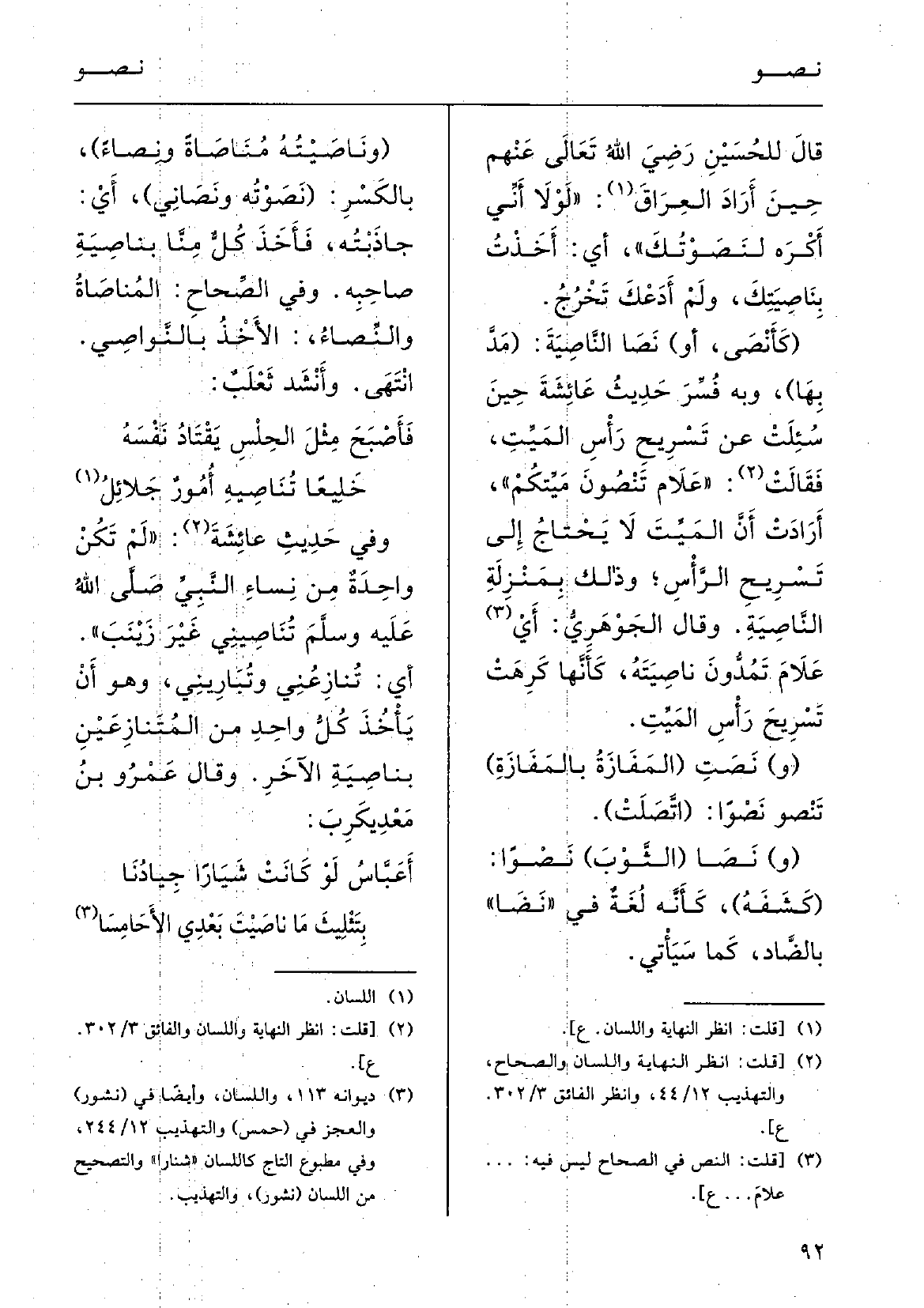 ( {كأَنْصَى أَو (} نَصَا {النَّاصِيَةَ: (مَدَّ بهَا) ؛ وَبِه فُسِّر حديثُ عائِشَةَ حينَ سُئِلَت عَن تَسْريحِ رأْسِ المَيِّتِ فَقَالَت: (عَلامَ} تَنْصُون ميِّتَكُم) ، أَرادَتْ أَنَّ الميِّتَ لَا يَحْتاجُ إِلَى تَسْريحِ الرأْسِ، وذلكَ بمنْزِلَةِ {الناصِيَةِ.