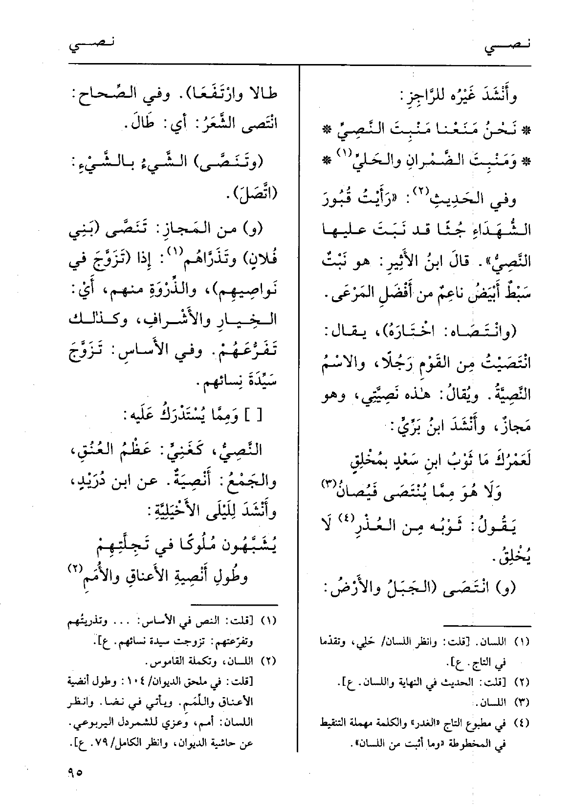 ومَنْبِتَ الضَّمْرانِ والحَلِيِّوفي الحديثِ: (رأَيْتُ قُبورَ الشُّهداءِ جُثاً قد نَبَتَ عَلَيْهَا} النَّصِيُّ) قالَ ابنُ الْأَثِير: هُوَ نَبْتٌ سَبْطٌ أَبيضُ ناعِمٌ مِن أَفْضَل المَرْعَى.