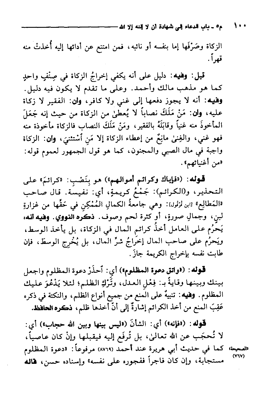 قوله: "فإياك وكرائمَ أموالهم"1 هو بنصب كرائم على التحذير، والكرائم جمع كريمة، أي: نفيسة. قال صاحب " المطالع [ابن قلقل] ". وهي جامعة الكمال الممكن في حقها من غزارة لبن وجمال صورة، أو كثرة لحم وصوف. ذكره النووي. وفيه أنه يحرم على العامل أخذ كرائم المال في الزكاة، بل يأخذ الوسط، ويحرم على صاحب المال إخراج شر المال، بل يخرج: الوسط، فإن طابت نفسه بإخراج الكريمة جاز.