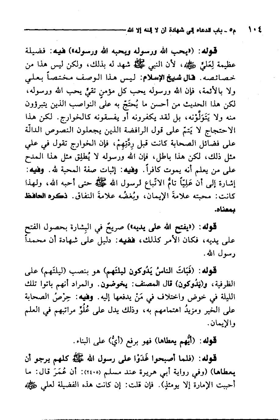 قوله: "يحب الله ورسوله ويحبه الله ورسوله". فيه فضيلة عظيمة لعلي رضي الله عنه لأن النبي صلى الله عليه وسلم شهد له بذلك، ولكن ليس هذا من خصائصه. قال شيخ الإسلام: ليس هذا الوصف مختصًا بعلي ولا بالأئمة، فإن الله ورسوله يحب كل مؤمن تقي يحب الله ورسوله، لكن هذا الحديث من أحسن ما يحتج به على النواصب الذي يتبرؤون منه ولا يتولونه، بل لقد يكفرونه أو يفسقونه كالخوارج. لكن هذا الاحتجاج لا يتم على قول الرافضة الذين يجعلون النصوص الدالة على فضائل الصحابة كانت قبل ردتهم، فإن الخوارج تقول في علي مثل ذلك، لكن هذا باطل فإن الله ورسوله لا يطلق مثل هذا المدح على من يعلم أنه يموت كافرًا. وفيه إثبات صفة المحبة لله، وفيه إشارة إلى أن عليًا تام الاتباع لرسول الله صلى الله عليه وسلم حتى أحبه الله، ولهذا كانت محبته علامة الإيمان، وبغضه علامة النفاق ذكره. الحافظ بمعناه.