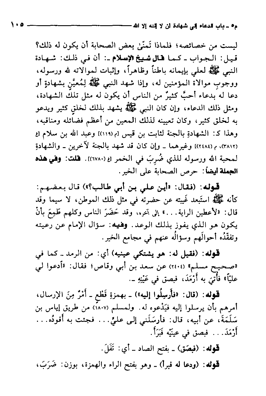 ليست من خصائصه; فلماذا تمنى بعض الصحابة أن يكون له ذلك؟ قيل الجواب كما قال شيخ الإسلام أن في ذلك شهادة النبي صلى الله عليه وسلم لعلي بإيمانه باطنًا وظاهرًا، وإثبات لموالاته لله ورسوله، ووجوب موالاة المؤمنين له، وإذا شهد النبي صلى الله عليه وسلم لمعين بشهادة أو دعا له بدعاء أحب كثير من الناس أن يكون له مثل تلك الشهادة، ومثل ذلك الدعاء، وإن كان النبي صلى الله عليه وسلم يشهد بذلك لخلق كثير ويدعو به لخلق كثير، وكان تعيينه لذلك المعين من أعظم فضائله ومناقبه، وهذا كالشهادة بالجنة لثابت بن قيس، وعبد الله بن سلام وغيرهما، ـ وإن كان قد شهد بالجنة لآخرين ـ، والشهادة لمحبة الله ورسوله للذي ضرب في الخمر. قلت: وفي هذه الجملة أيضًا حرص الصحابة على الخير.