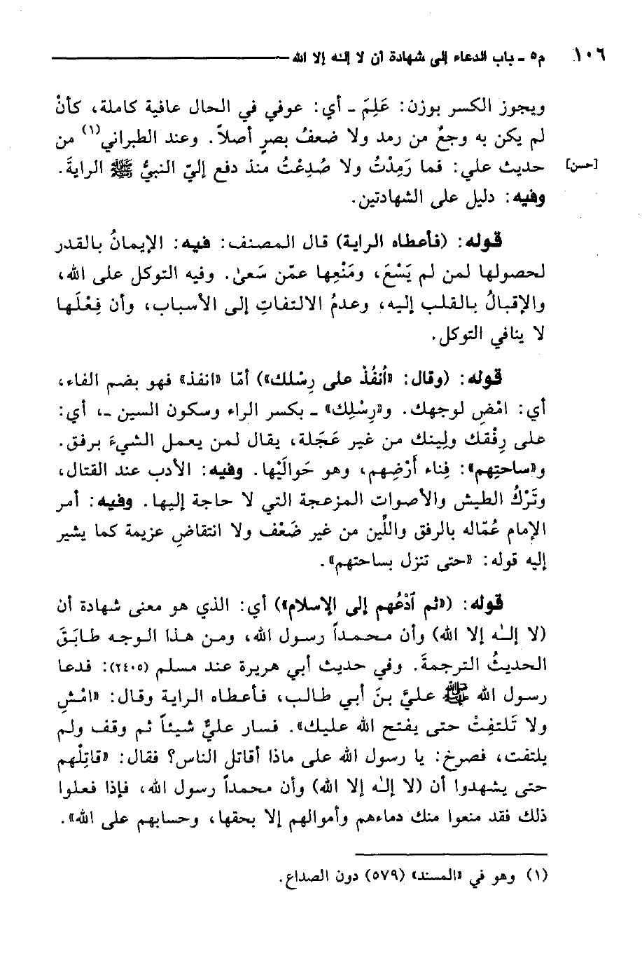 وفي حديث أبي هريرة عند مسلم: "فدعا رسول الله صلى الله عليه وسلم عليّ بن أبي طالب، فأعطاه الراية. وقال: امش ولا تلتفت حتى يفتح الله عليك. فسار علي شيئًا ثم وقف ولم يلتفت، فصرخ: يا رسول الله على ماذا أقاتل الناس؟ فقال: قاتلهم حتى يشهدوا أن لا إله إلا الله وأن محمدًا رسول الله، فإذا فعلوا ذلك فقد منعوا منك دماءهم وأموالهم إلا بحقها وحسابهم على الله" 1.