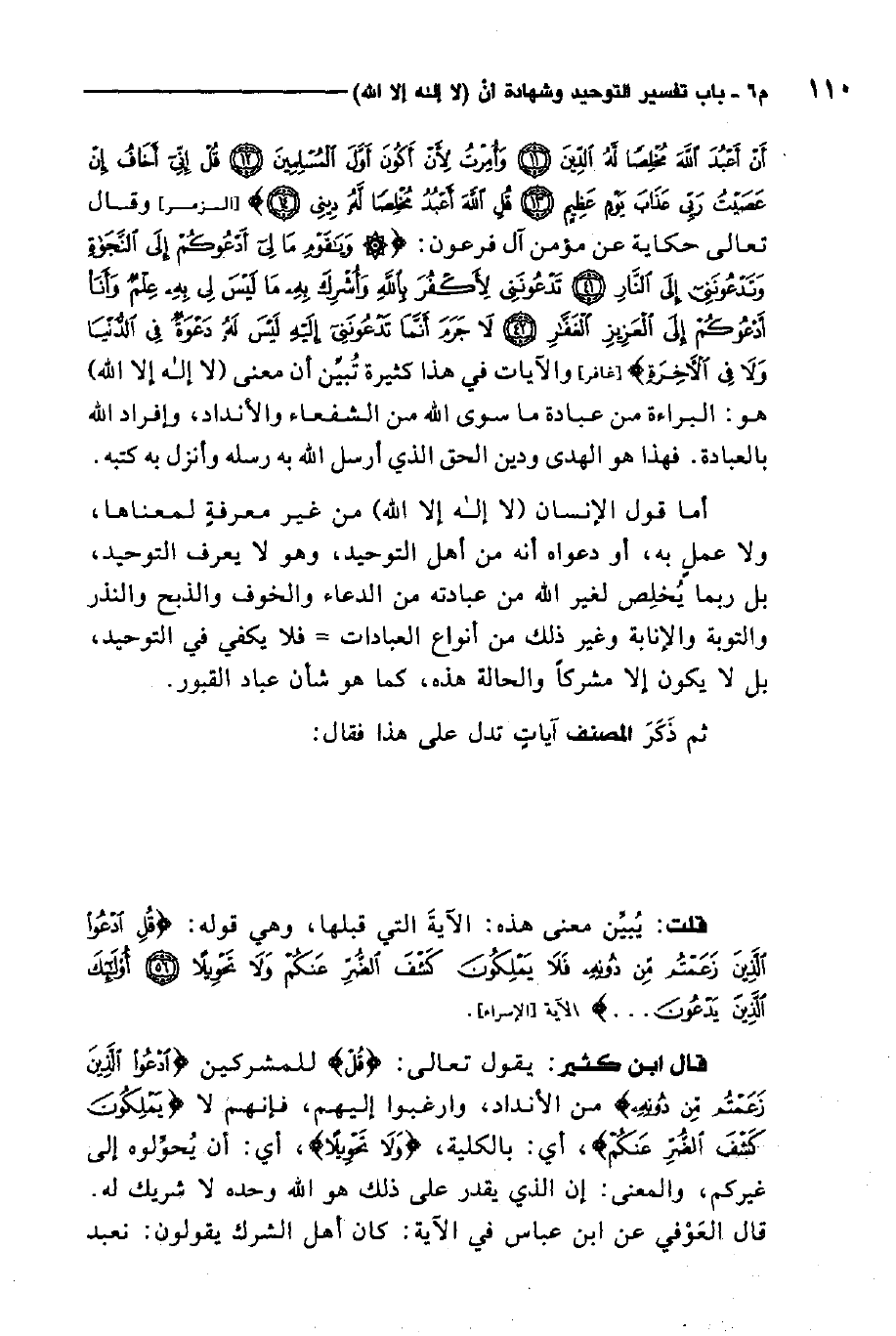 أما قول الإنسان: " لا إله إلا الله " من غير معرفة لمعناها، ولا عمل به، أو دعواه أنه من أهل التوحيد، وهو لا يعرف التوحيد، بل ربما يخلص لغير الله من عبادته من الدعاء والخوف والذبح والنذر والتوبة والإنابة وغير ذلك من أنواع العبادات، فلا يكفي في التوحيد، بل لا يكون إلا مشركًا والحالة هذه، كما هو شأن عباد القبور. ثم ذكر المصنف آيات تدل على هذا فقال: وقول الله تعالى: {أُولَئِكَ الَّذِينَ يَدْعُونَ يَبْتَغُونَ إِلَى رَبِّهِمُ الْوَسِيلَةَ أَيُّهُمْ أَقْرَبُ وَيَرْجُونَ رَحْمَتَهُ وَيَخَافُونَ عَذَابَهُ إِنَّ عَذَابَ رَبِّكَ كَانَ مَحْذُوراً} 3 الآية.