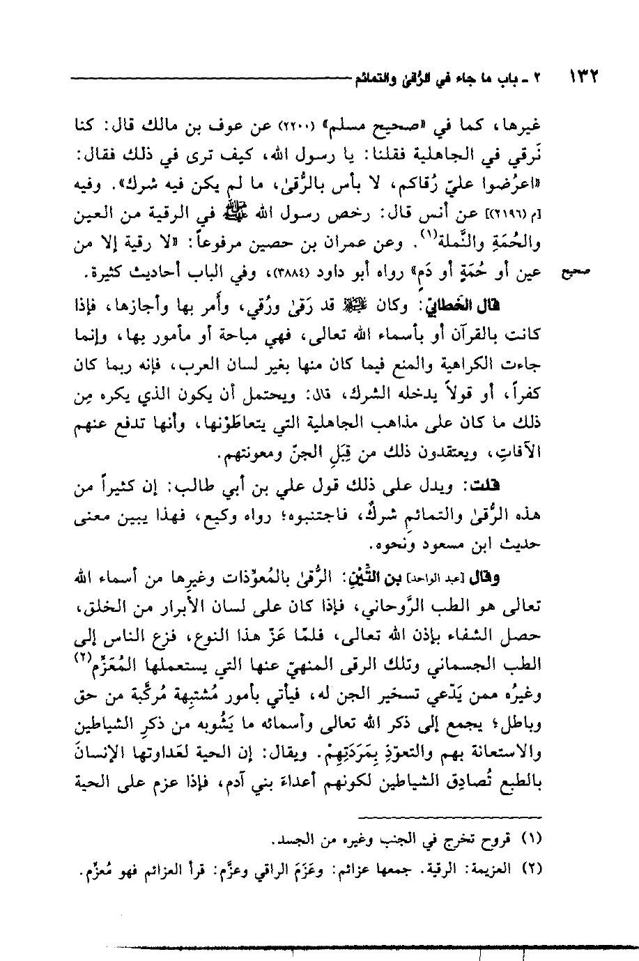قال الخطابي: وكان عليه السلام قد رقى ورقي، وأمر بها وأجازها، فإذا كانت بالقرآن أو بأسماء الله تعالى، فهي مباحة أو مأمور بها، وإنما جاءت الكراهية والمنع فيما كان منها بغير لسان العرب، فإنه ربما كان كفرًا، أو قولاً يدخله الشرك، قال: ويحتمل أن يكون الذي يكره من ذلك ماكان على مذاهب الجاهلية التي يتعاطونها، وأنها تدفع عنهم الآفات، ويعتقدون ذلك من قبل الجن ومعونتهم.