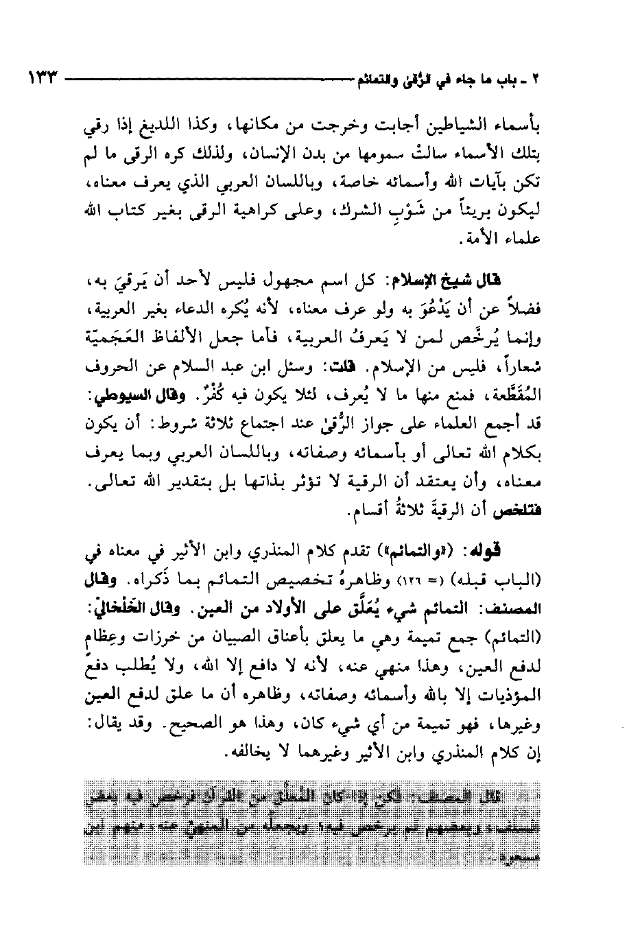 وقال المصنف: التمائم شيء يعلق على الأولاد من العين. وقال الخلخالي: التمائم جمع تميمة وهي ما يعلق بأعناق الصبيان من خرزات وعظام لدفع العين، وهذا منهي عنه، لأنه لا دافع إلا الله، ولا يطلب دفع المؤذيات إلا بالله وأسمائه وصفاته، وظاهره أن ما علق لدفع العين وغيرها فهو تميمة من أي شيء كان، وهذا هو الصحيح.