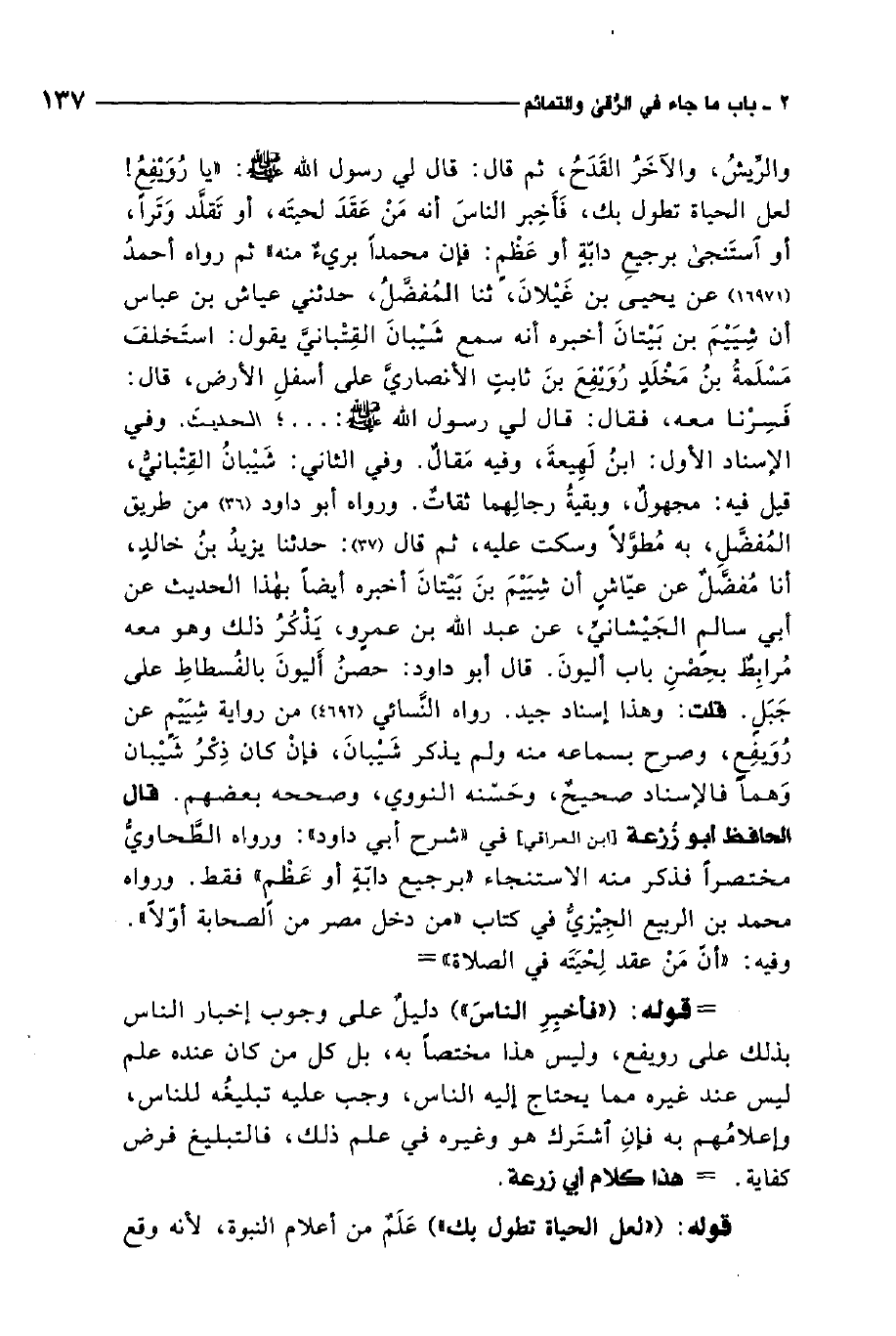 والريش، والآخر القدح، ثم قال: قال لي رسول الله صلى الله عليه وسلم "يا رويفع لعل الحياة تطول بك، فأخبر الناس أنه من عقد لحيته، أو تقلد وترًا، أو استنجى برجيع دابة أو عظم فإن محمدا بريء منه". ثم رواه أحمد عن يحيى بن غيلان، ثنا المفضل، حدثني عياش بن عباس أن شييم بن بيتان أخبره أنه سمع شيبان القتباني يقول: استخلف مسلمة بن مخلد رويفع بن ثابت الأنصاري على أسفل الأرض، قال: فسرنا معه، فقال: قال لي رسول الله صلى الله عليه وسلم ... الحديث.