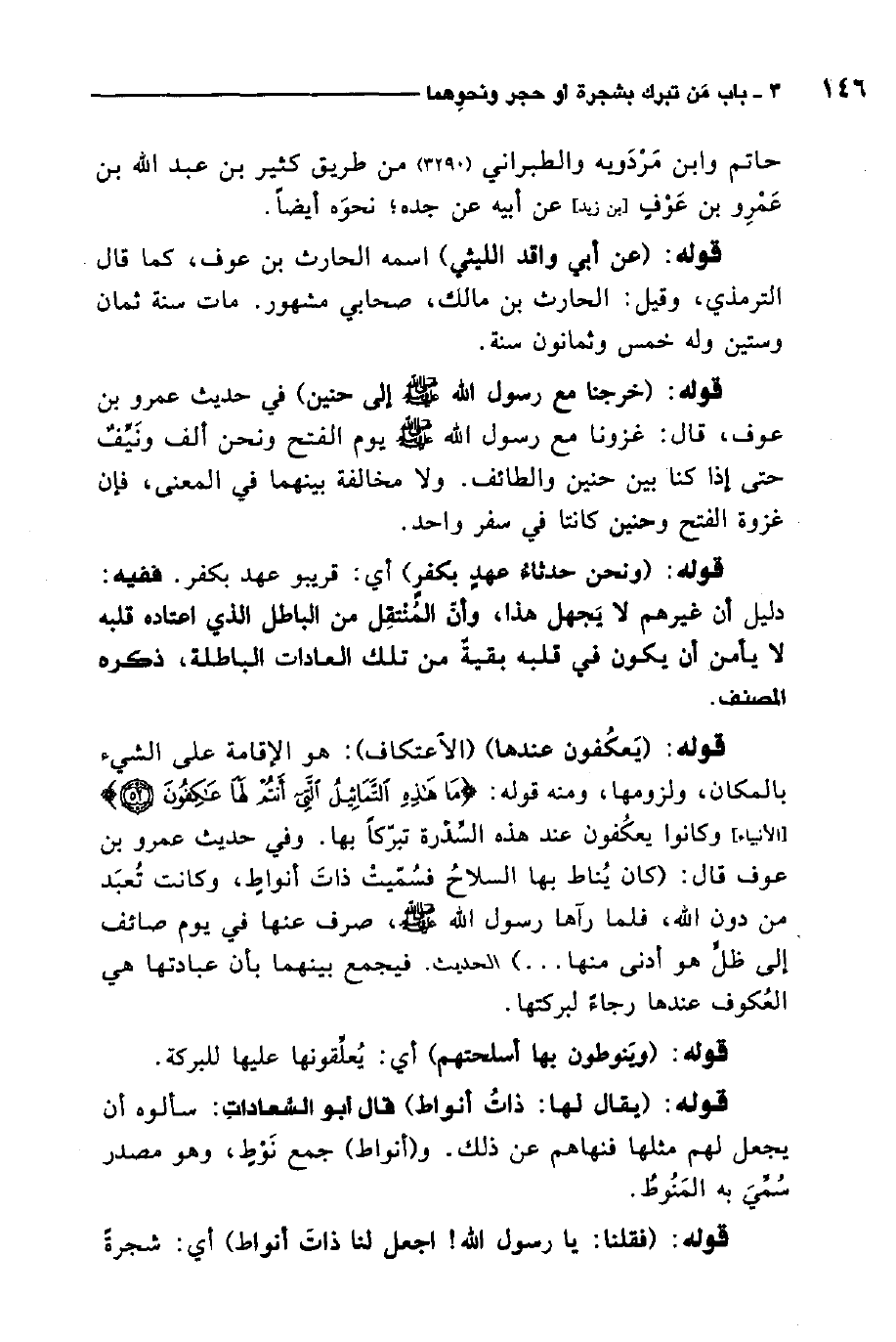 قوله:"يعكفون عندها". الاعتكاف: هو الإقامة على الشيء بالمكان، ولزومها، ومنه قوله: {مَا هَذِهِ التَّمَاثِيلُ الَّتِي أَنْتُمْ لَهَا عَاكِفُونَ} 1. وكانوا يعكفون عند هذه السدرة تبركًا بها. وفي حديث عمرو بن عوف قال،: كان يناط بها السلاح فسميت ذات أنواط، وكانت تعبد من دون الله، فلما رآها رسول الله صلى الله عليه وسلم صرف عنها في يوم صائف إلى ظل هو أدنى منها. الحديث فيجمع بينهما بأن عبادتها هي العكوف عندها رجاء لبركتها.
