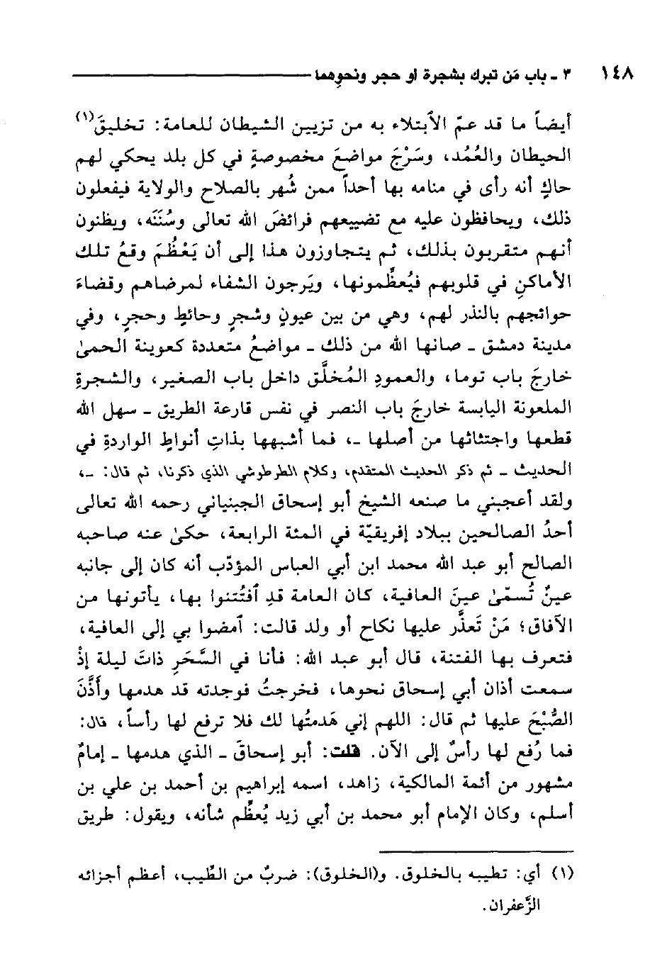 أيضًا ما قد عم الابتلاء به من تزيين الشيطان للعامة، تخليق الحيطان والعمد، وسرج مواضع مخصوصة في كل بلد يحكي لهم حاكٍ أنه رأى في منامه بها أحدًا ممن شهر بالصلاح والولاية فيفعلون ذلك، ويحافظون عليه مع تضييعهم فرائض الله تعالى وسننه، ويظنون أنهم متقربون بذلك، ثم يتجاوزون هذا إلى أن يعظم وقع تلك الأماكن في قلوبهم فيعظمونها، ويرجون الشفاء لمرضاهم وقضاء حوائجهم بالنذر لهم، وهي من بين عيون وشجر وحائط وحجر، وفي مدينة دمشق صانها الله من ذلك مواضع متعددة كعوينة الحما خارج باب توما، والعمود المخلق داخل باب الصغير، والشجرة الملعونة اليابسة خارج باب النصر في نفس قارعة الطريق، سهل الله قطعها واجتثاثها من أصلها، فما أشبهها بذات أنواط الواردة في الحديث! ثم ذكر الحديث المتقدم، وكلام الطرطوشي الذي ذكرنا، ثم قال: ولقد أعجبني ما صنعه الشيخ أبو إسحاق الجبنياني رحمه الله تعالى أحد الصالحين ببلاد أفريقية في المائة الرابعة حكى عنه صاحبه الصالح أبو عبد الله محمد ابن أبي العباس المؤدب أنه كان إلى جانبه عين تسمى عين العافية، كان العامة قد افتتنوا بها يأتونها من الآفاق، من تعذر عليها نكاح أو ولد قالت: امضوا بي إلى العافية، فتعرف بها الفتنة، قال أبو عبد الله: فأنا في السحر ذات ليلة إذ سمعت أذان أبي إسحاق نحوها، فخرجت فوجدته قد هدمها وأذن الصبح عليها ثم قال: اللهم إني هدمتها لك فلا ترفع لها رأسًا، قال: فما رفع لها رأس إلى الآن.