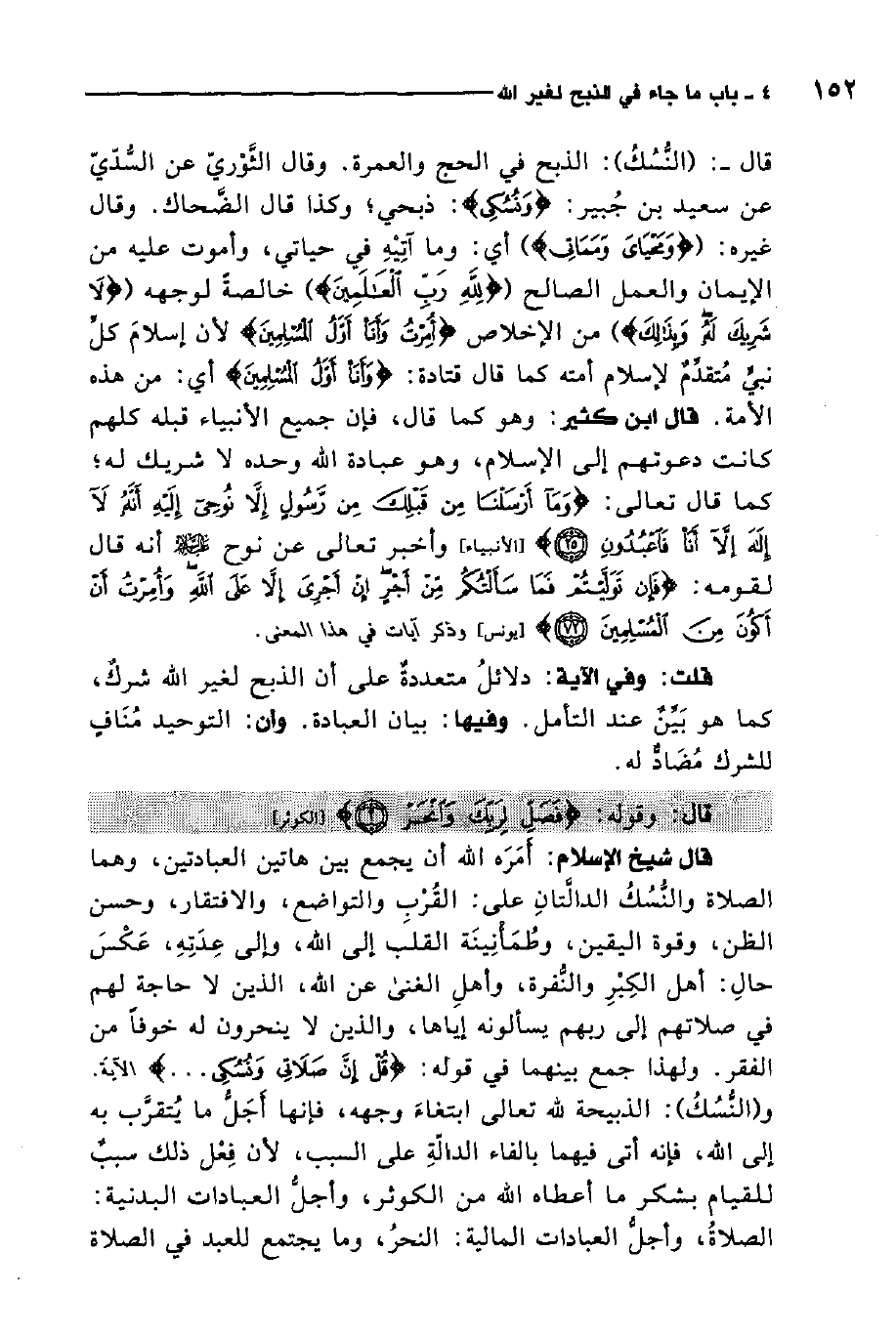 قال وقوله: {فَصَلِّ لِرَبِّكَ وَانْحَرْ} 3. قال شيخ الإسلام: أمره الله أن يجمع بين هاتين العبادتين، وهما: الصلاة والنسك الدالتان على القرب والتواضع والافتقار، وحسن الظن، وقوة اليقين، وطمأنينة القلب إلى الله، وإلى عدته، عكس حال أهل الكبر والنفرة، وأهل الغنى عن الله الذين لا حاجة لهم في صلاتهم إلى ربهم يسألونه إياها، والذين لا ينحرون له خوفًا من الفقر. ولهذا جمع بينهما في قوله: {قُلْ إِنَّ صَلاتِي وَنُسُكِي} الآية. والنسك: الذبيحة لله تعالى ابتغاء وجهه، فإنها أجل ما يتقرب به إلى الله، فإنه أتى فيهما بالفاء الدالة على السبب، لأن فعل ذلك سبب للقيام بشكر ما أعطاه الله من الكوثر، وأجل العبادات البدنية الصلاة، وأجل العبادات المالية النحر، وما يجتمع للعبد في الصلاة