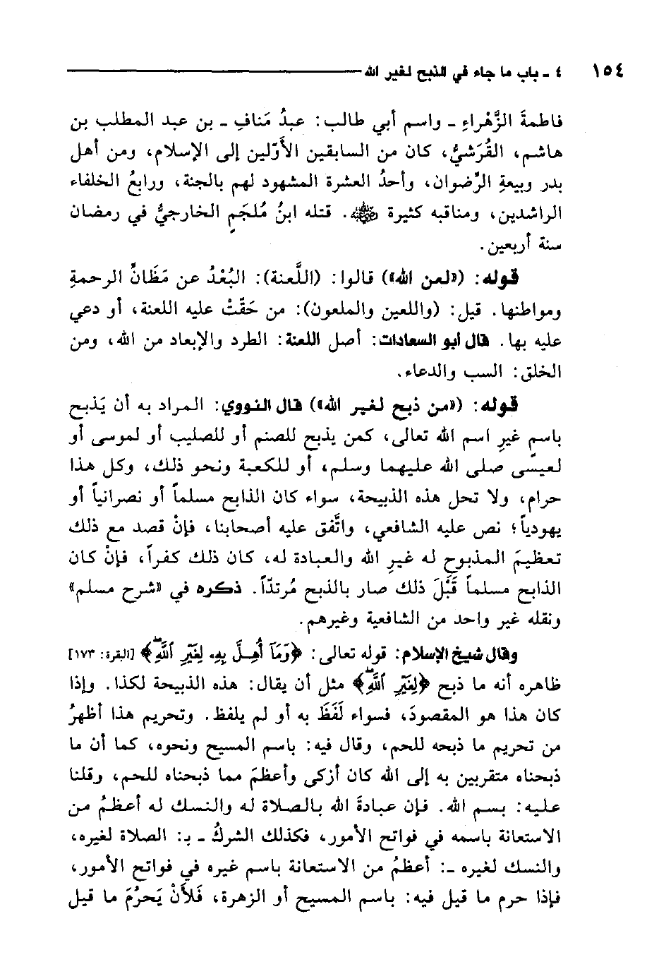 قوله:"من ذبح لغير الله". قال النووي. المراد به أن يذبح باسم غير اسم الله تعالى، كمن يذبح للصنم أو للصليب أو لموسى أو لعيسى صلى الله عليهما وسلم، أو للكعبة ونحو ذلك، وكل هذا حرام، ولا تحل هذه الذبيحة سواء كان الذابح مسلمًا أو نصرانيًا أو يهوديًا نص عليه الشافعي واتفق عليه أصحابنا، فإن قصد مع ذلك تعظيم المذبوح له غير الله والعبادة له، كان ذلك كفرًا، فإن كان الذابح مسلمًا قبل ذلك صار بالذبح مرتدًا. ذكره في "شرح مسلم" ونقله غير واحد من الشافعية وغيرهم.