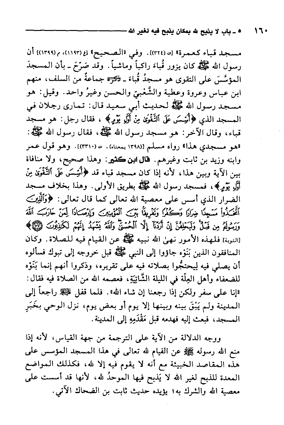 ذكره جماعة من السلف، منهم: ابن عباس وعروة وعطية والشعبي والحسن وغير واحد. وقيل: هو مسجد رسول الله صلى الله عليه وسلم لحديث أبي سعيد قال: "تمارى رجلان في المسجد الذي أسس على التقوى من أول يوم، فقال رجل هو مسجد قباء، وقال الآخر: هو مسجد رسول الله صلى الله عليه وسلم فقال رسول الله صلى الله عليه وسلم "هو مسجدي هذا" 3 رواه مسلم. وهو قول عمر وابنه وزيد بن ثابت وغيرهم. قال ابن كثير: وهذا صحيح، ولا منافاة بين الآية وبين هذا، لأنه إذا كان مسجد قباء قد أسس على التقوى من أول يوم، فمسجد رسول الله صلى الله عليه وسلم بطريق الأولى. وهذا بخلاف مسجد الضرار الذي أسس على معصية الله تعالى كما قال تعالى: {وَالَّذِينَ اتَّخَذُوا مَسْجِداً ضِرَاراً وَكُفْراً وَتَفْرِيقاً بَيْنَ الْمُؤْمِنِينَ وَإِرْصَادَاً لِمَنْ حَارَبَ اللَّهَ وَرَسُولَهُ مِنْ قَبْلُ وَلَيَحْلِفُنَّ إِنْ أَرَدْنَا إِلا الْحُسْنَى وَاللَّهُ يَشْهَدُ إِنَّهُمْ لَكَاذِبُونَ} 4. فلهذه الأمور نهى الله نبيه صلى الله عليه وسلم عن القيام فيه للصلاة، وكان المنافقون الذين بنوه جاءوا إلى النبي صلى الله عليه وسلم قبل خروجه إلى تبوك فسألوه أن يصلي فيه ليحتجوا بصلاته فيه على تقريره. وذكروا أنهم إنما بنوه للضعفاء وأهل العلة في الليلة الشاتية، فعصمه الله من الصلاة فيه فقال: "إنا على سفر ولكن إذا رجعنا إن شاء الله" فلما قفل عليه السلام راجعًا إلى المدينة ولم يبق بينه وبينها إلا يوم أو بعض يوم، نزل الوحي بخبر المسجد، فبعث إليه فهدمه قبل مقدمه إلى المدينة" ووجه الدلالة من الآية على الترجمة من جهة القياس، لأنه إذا منع الله رسوله صلى الله عليه وسلم عن القيام لله تعالى في هذا المسجد المؤسس على هذه المقاصد الخبيثة مع أنه لا يقوم فيه إلا لله، فكذلك المواضع المعدة للذبح لغير الله لا يذبح فيها الموحد لله، لأنها قد أسست على معصية الله والشرك به، يؤيده حديث ثابت بن الضحاك الآتي.
