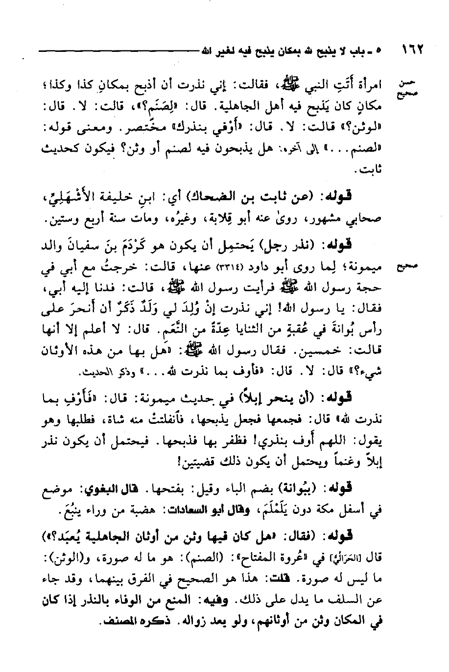 امرأة أتت النبي صلى الله عليه وسلم فقالت: إني نذرت أن أذبح بمكان كذا وكذا، مكان كان يذبح فيه أهل الجاهلية قال: "لصنم"، قالت: لا. قال: "لوثن؟ " قالت: لا قال: "أوف بنذرك" 1. مختصر. ومعنى قوله: "لصنم" إلى آخره. هل يذبحون فيه لصنم أو وثن فيكون كحديث ثابت.