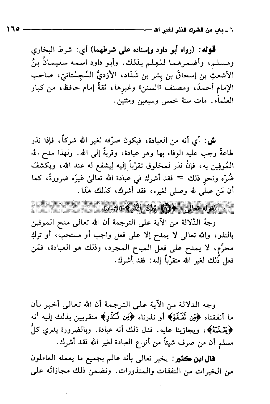 ش: أي إنه من العبادة، فيكون صرفه لغير الله شركًا، فإذا نذر طاعة وجب عليه الوفاء بها وهو عبادة، وقربة إلى الله. ولهذا مدح الله الموفين به، فإن نذر لمخلوق تقربًا إليه ليشفع له عند الله، ويكشف ضره ونحو ذلك فقد أشرك في عبادة الله تعالى غيره ضرورة، كما أن من صلى لله وصلى لغيره، فقد أشرك، كذلك هذا، لقوله تعالى: {يُوفُونَ بِالنَّذْرِ} 1 وجه الدلالة من الآية على الترجمة أن الله تعالى مدح الموفين بالنذر، والله تعالى لا يمدح إلا على فعل واجب أو مستحب، أو ترك محرم، لا يمدح على فعل المباح المجرد، وذلك هو العبادة، فمن فعل ذلك لغير الله متقربًا إليه فقد أشرك.